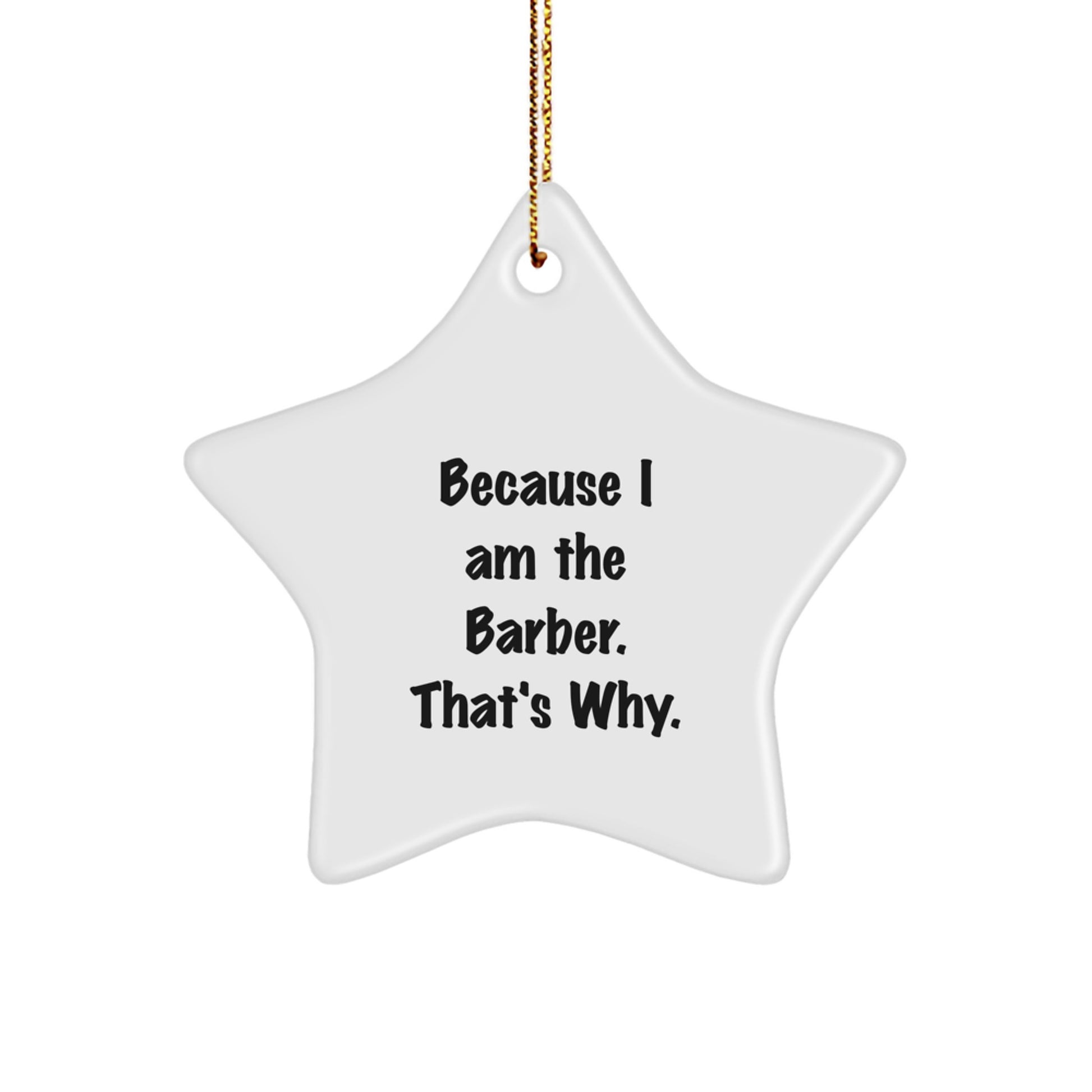 - This funny 'Because I Am The Barber. That's Why.' Star Ornament is a unique gift idea for barber friends and family. Made from sturdy MDF with a high-gloss plastic finish, this ornament is vibrant, lightweight, and long-lasting. It's the perfect way to show your support for your barber friend or family member and their profession.