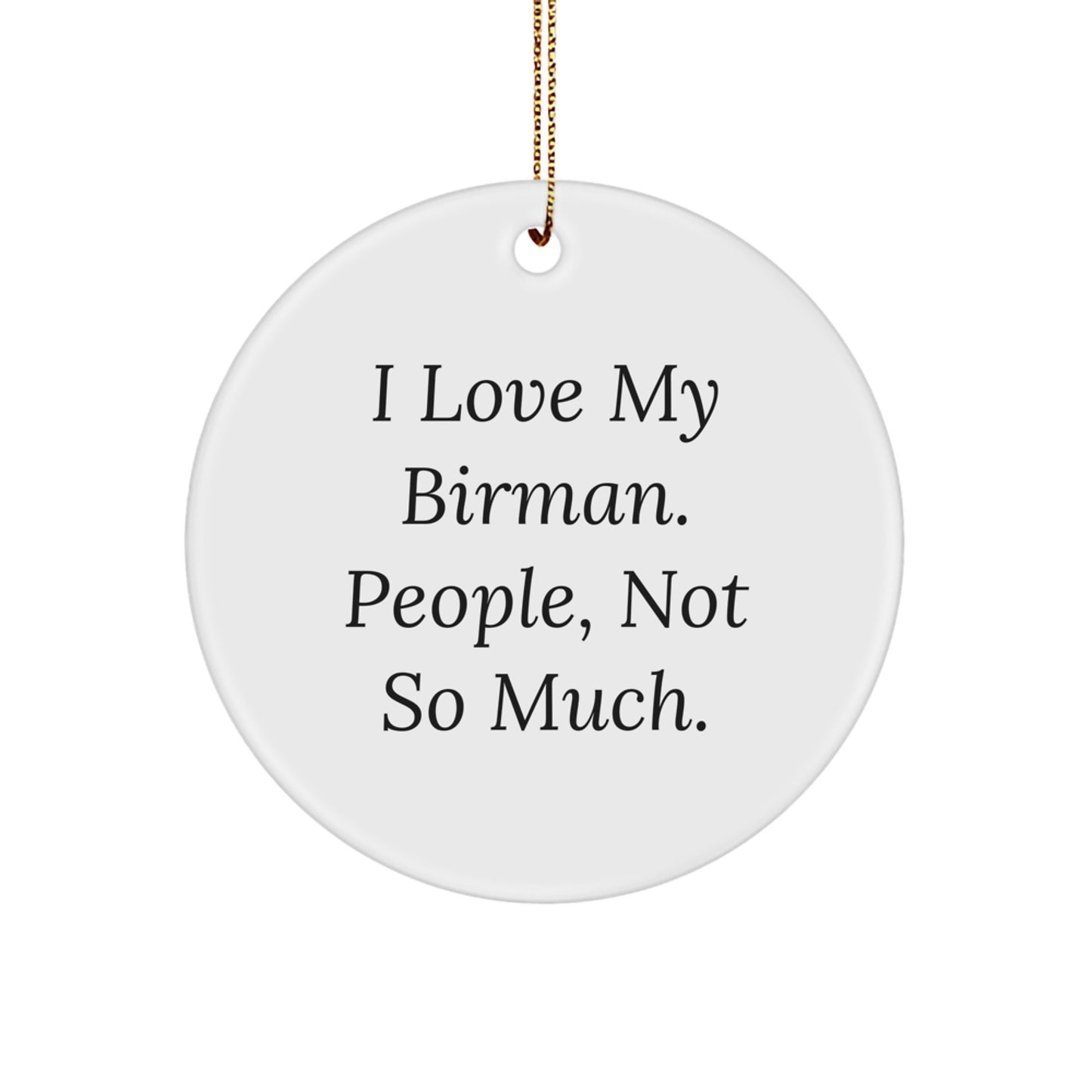 - Hang your 'I Love My Birman. People, Not So Much.' Circle Ornament proudly and decorate your home with a beautiful and meaningful decoration. With its festive gold cord and stunning design, this ornament is sure to be a hit with any Birman Cat lover in your life. Make it a part of your holiday traditions and enjoy it for years to come.