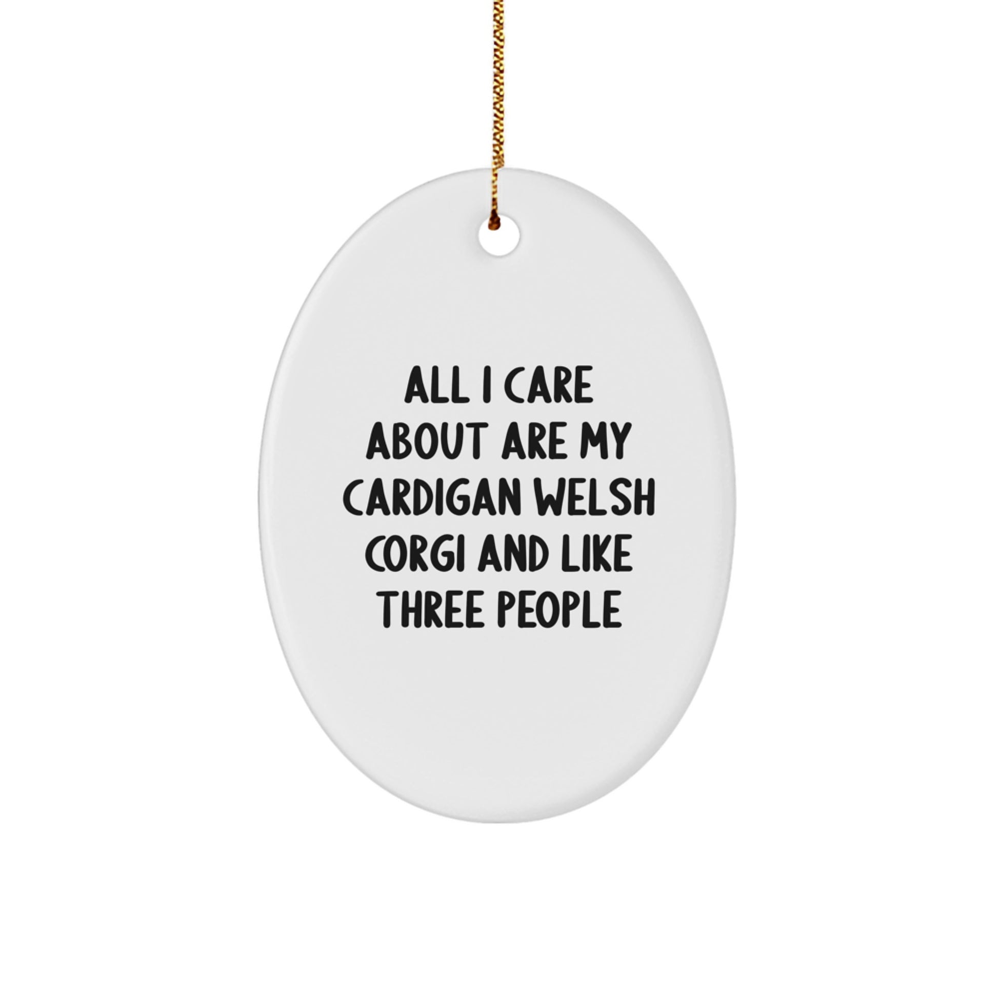 - Add a touch of Cardigan Welsh Corgi charm to your holiday decor with this vibrant Oval Ornament, featuring a beautiful depiction of the beloved breed, complete with its signature fluffy coat and adorable facial expression.'All I Care About Are My Cardigan Welsh Corgi And Like Three People' is the perfect quote to adorn this ornament, making it a thoughtful gift for any Cardigan Welsh Corgi enthusiast.