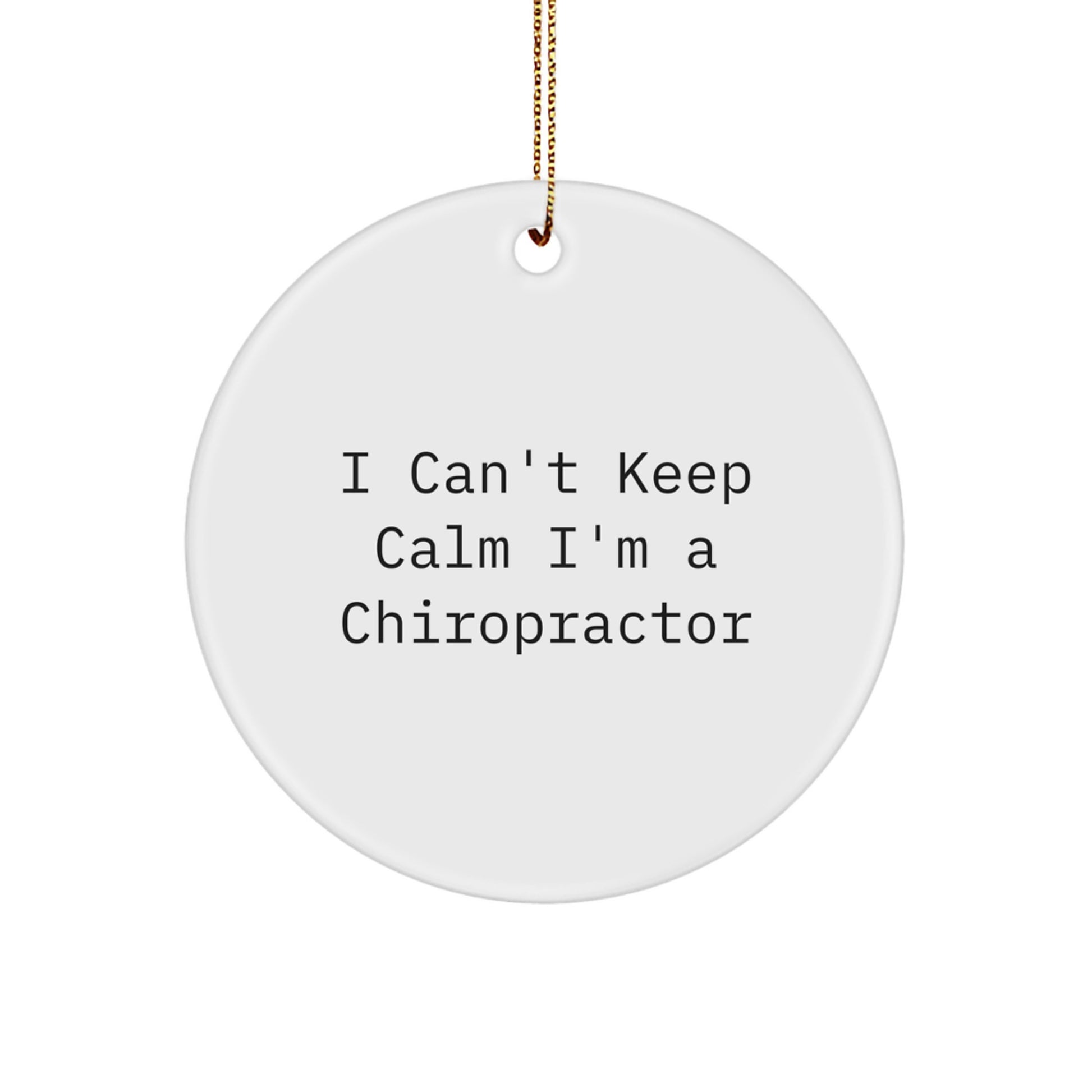 - This 'I Can't Keep Calm I'm A Chiropractor' Christmas Ornament is a unique and funny gift for the Chiropractor in your life. Its vibrant colors and fun design make it a great addition to any room. Plus, it's a great conversation starter. Whether you're a family member, friend, or coworker, this gift is sure to bring a smile to their face. The ornament is made from sturdy MDF with a high-gloss plastic finish, ensuring it will last for years to come.