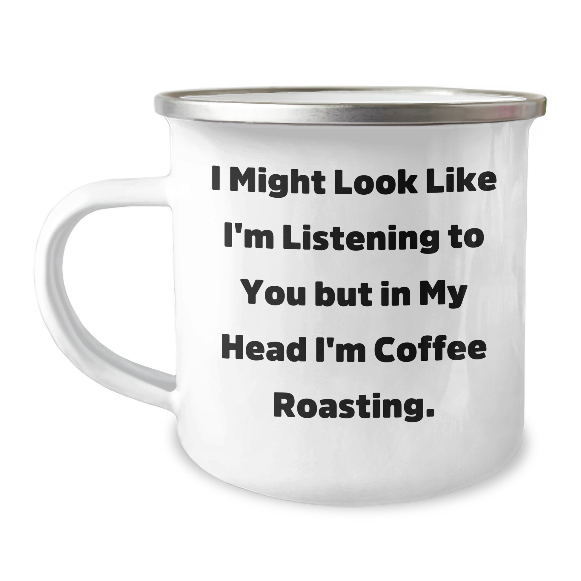 Funny Coffee Roasting Gifts for Friends, Men, and Women - 'I Might Look Like I'm Listening To You But In My Head I'm Coffee Roasting.' Quote on Camping Mug