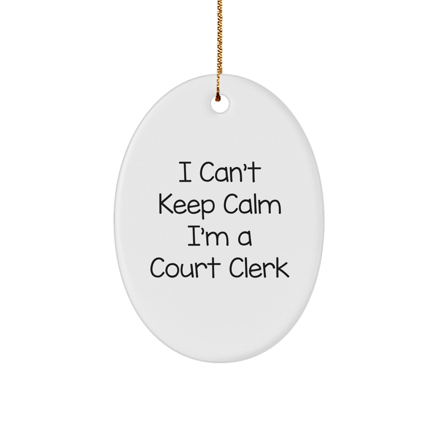 - Bring some laughter and joy to the Court Clerk in your life with our funny 'I can't keep calm I'm a Court Clerk' Oval Ornament. Made from sturdy MDF with a high-gloss plastic finish, this ornament is not only sturdy but also vibrantly printed from edge-to-edge via Sublimation, ensuring bright, vivid colors. Perfect for Court Clerk enthusiasts and those who appreciate a good laugh!