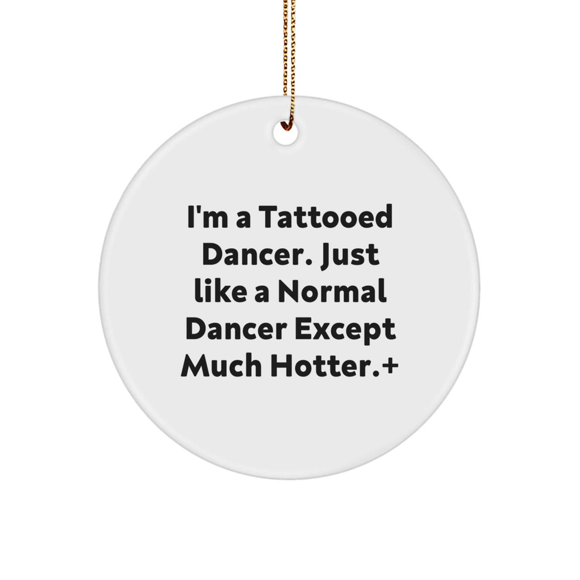Are you a Dancer or do you know someone who loves to dance? Look no further! Our Dancer Circle Ornament is the ideal gift for the special Dancer in your life. This vibrant ornament features the quote 'I'm A Tattooed Dancer. Just Like A Normal Dancer Except Much Hotter.+', sure to bring a smile to the face of any Dancer.
