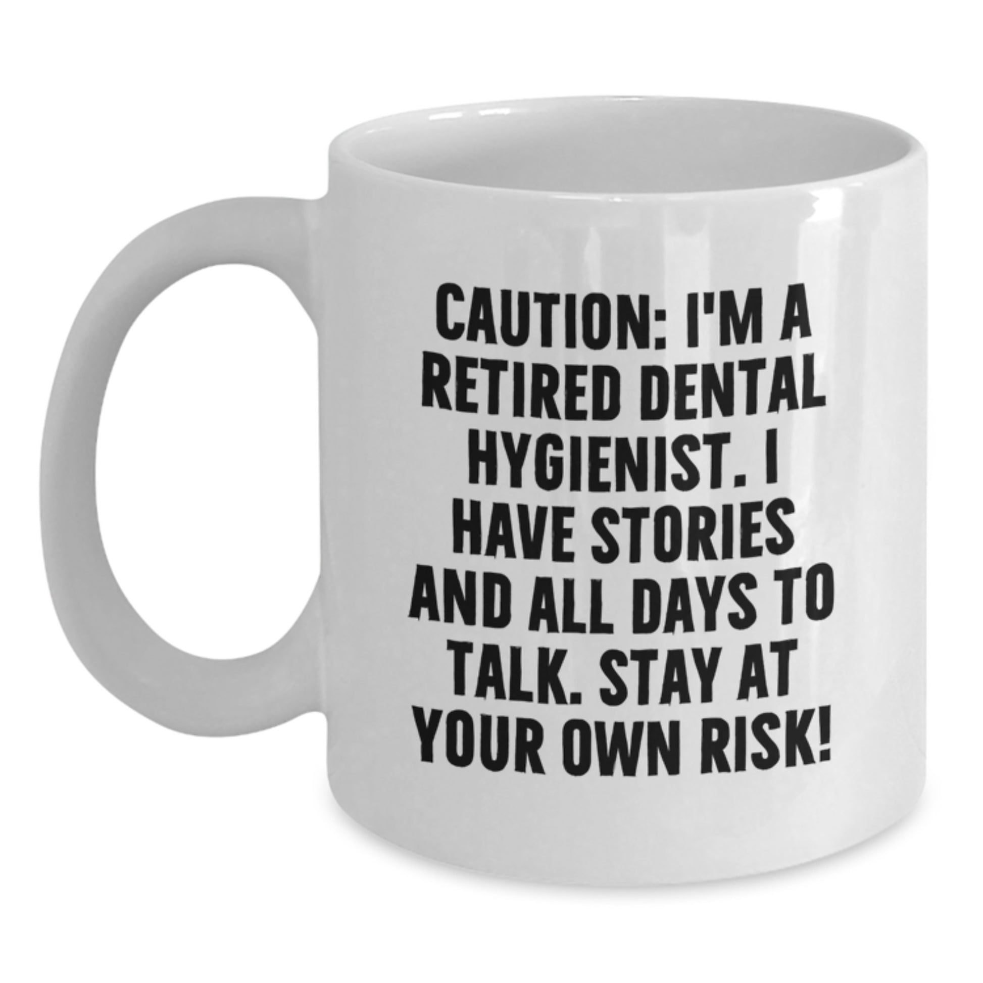Are you looking for a unique and funny gift for the dental hygienist in your life? Look no further! This white coffee mug is perfect for any dental hygienist enthusiast. As a retired dental hygienist, I have stories to tell and days to talk, so you've been warned!
