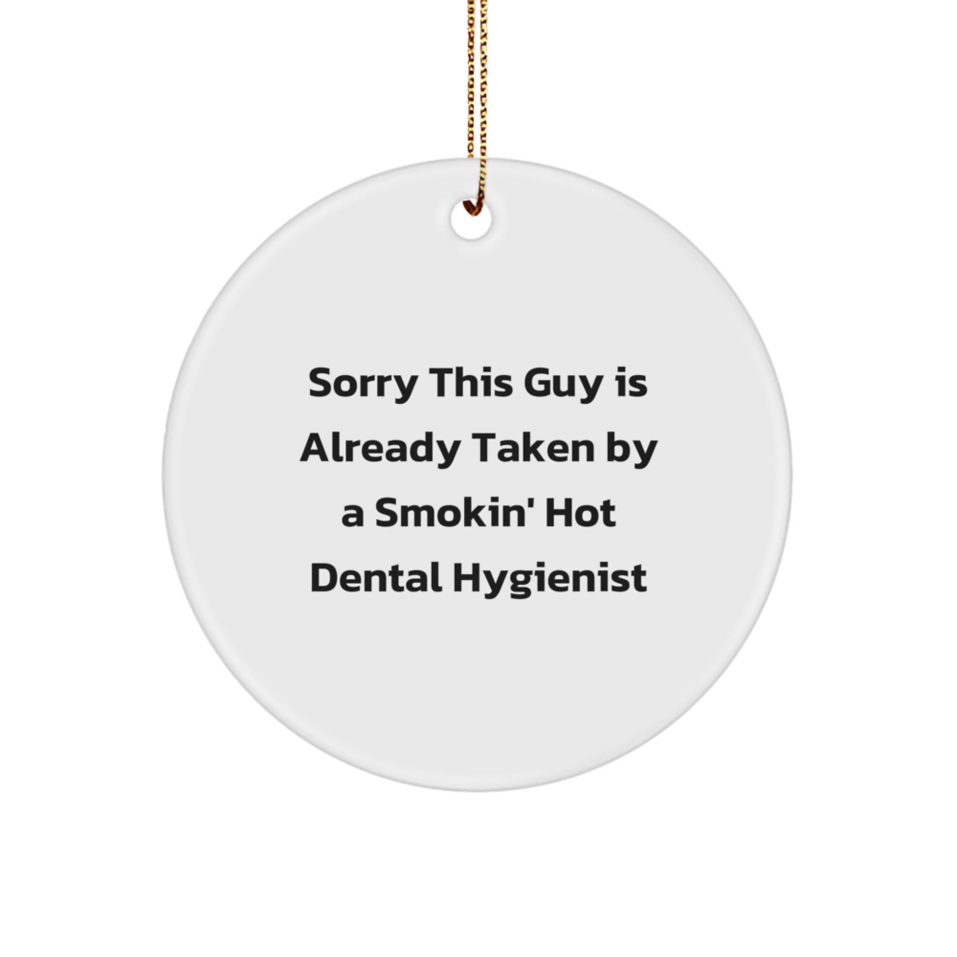 - This 'Sorry This Guy Is Already Taken By A Smokin' Hot Dental Hygienist' Circle Ornament is a great way to add some humor and personality to any room. Whether you're a fan of the quote or just looking for a fun and quirky gift, this Circle Ornament is sure to bring a smile to the face of any dental hygienist.