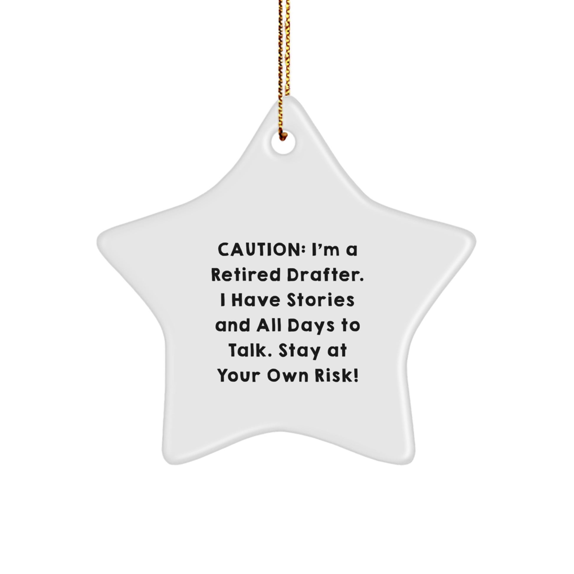 Are you a Drafter enthusiast or looking for a fun gift for your favorite Drafter? Look no further! This hilarious Star Ornament is the perfect addition to any office or home, with its funny quote 'Caution: I'm A Retired Drafter. I Have Stories And All Days To Talk. Stay At Your Own Risk!' printed on it. Made from sturdy MDF with a high-gloss plastic finish, this Star Ornament is a great gift for any Drafter, whether you're a coworker, friend, or family member. Whether it's Christmas, a birthday, or just a random Tuesday, this Star Ornament is sure to bring a smile to your face.