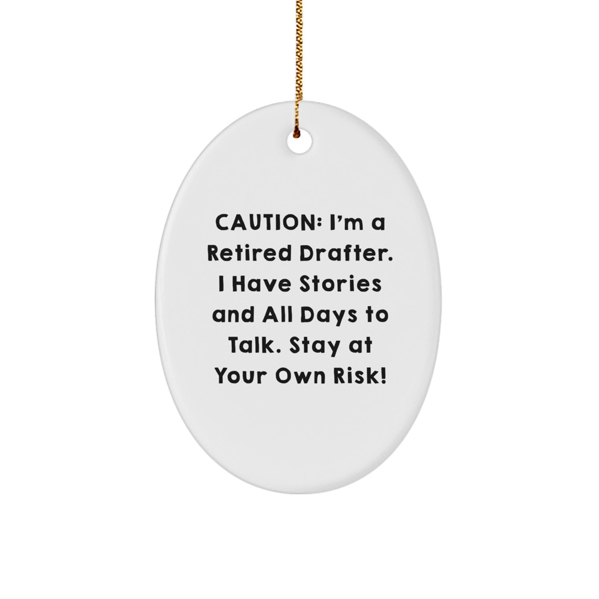 Are you a Drafter enthusiast or do you know someone who's passionate about drafting? Then this unique Oval Ornament is a must-have, featuring a hilarious quote from a retired Drafter who's ready to share tales and stories at your own risk!