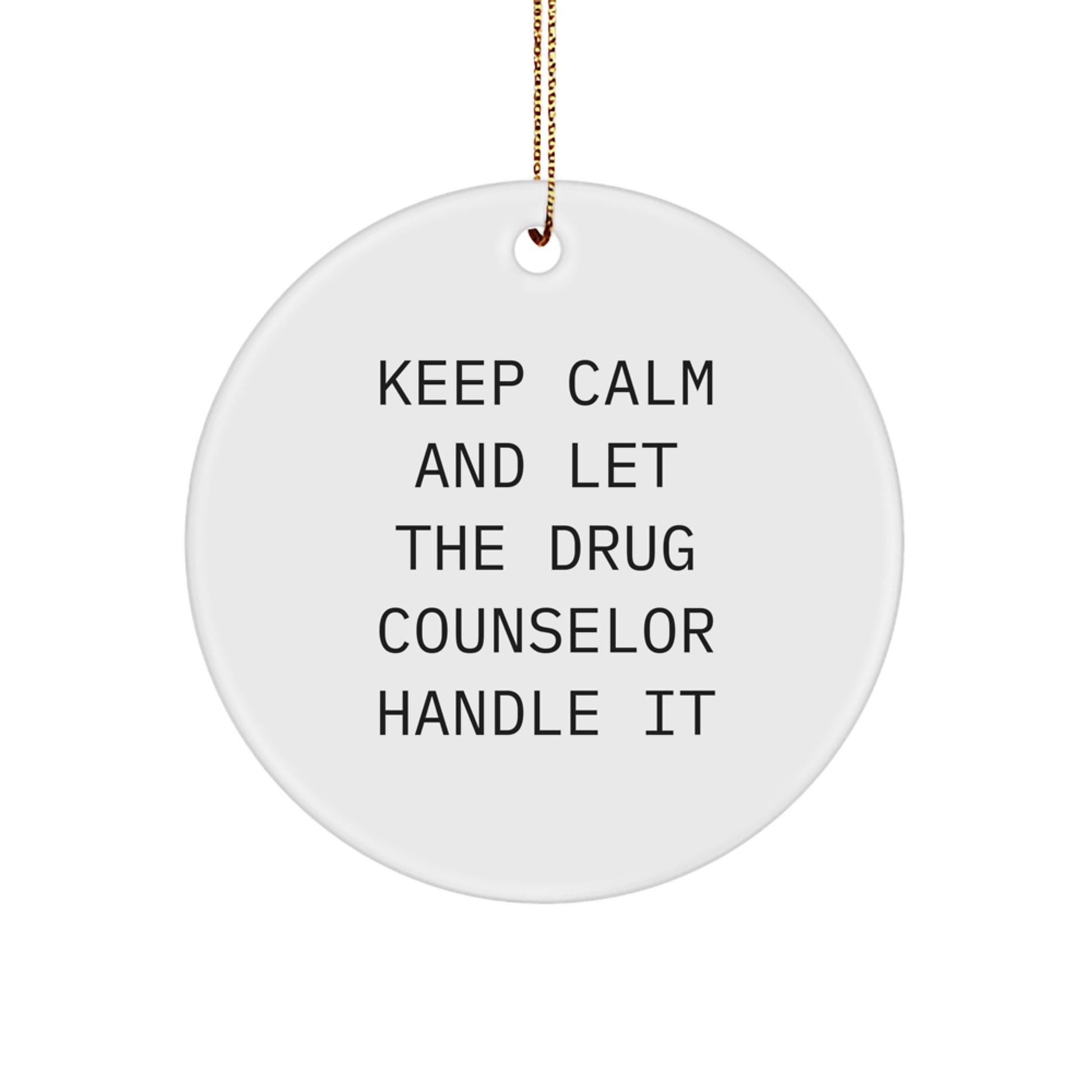 - Add a touch of inspiration to your holiday decor with a beautiful Drug Counselor Circle Ornament, made from MDF with a high-gloss plastic finish, and featuring a motivational 'Keep Calm And Let The Drug Counselor Handle It' message that is sure to uplift and inspire those around you. Hang it in your home, office, or give it as a gift to someone who needs support and guidance.