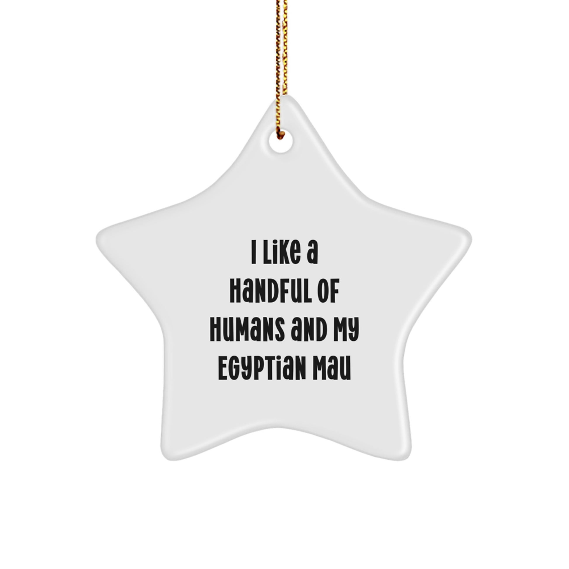 Are you an Egyptian Mau Cat enthusiast or know someone who is? This adorable Star Ornament featuring the quote 'I Like A Handful Of Humans And My Egyptian Mau' is a must-have for the holiday season. The Egyptian Mau Cat, known for its striking appearance and affectionate nature, is a beloved breed by many.