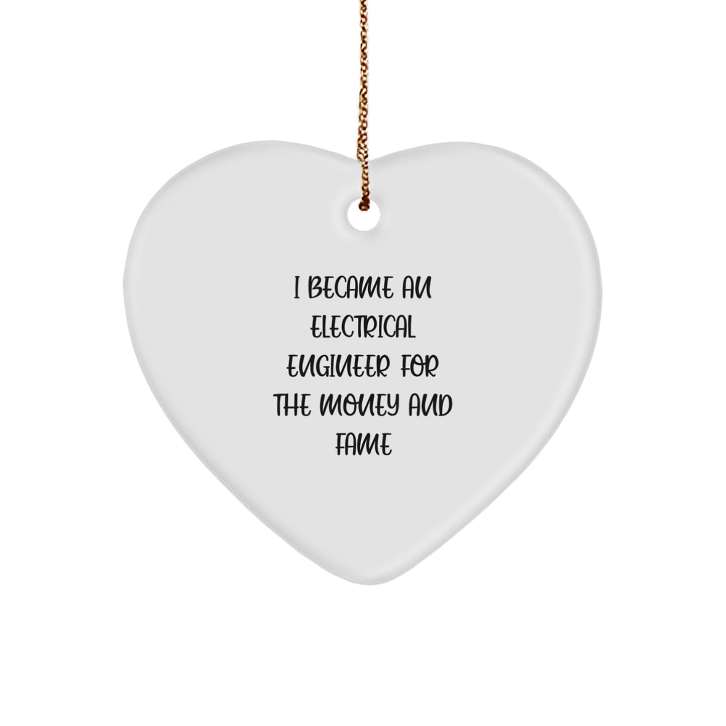 - Whether you're buying for an Electrical Engineer who's in it for the money or just wants to show off their skills, this heart ornament is sure to bring a smile to their face. It's the perfect way to poke fun at their 'I Became An Electrical Engineer For The Money And Fame' story.