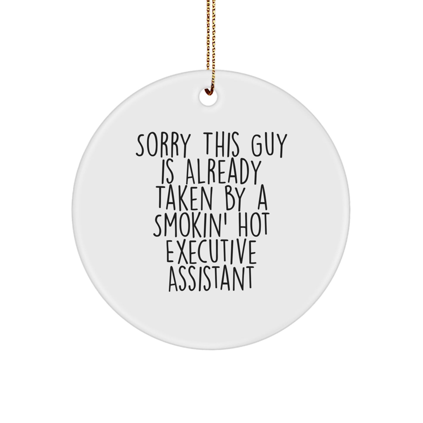 Say goodbye to boring office gifts and hello to laughter with this hilarious 'Sorry This Guy Is Already Taken By A Smokin' Hot Executive Assistant' Circle Ornament! As a fun and unique gift for Executive Assistants, this ornament is perfect for expressing your appreciation and admiration for their hard work and dedication.