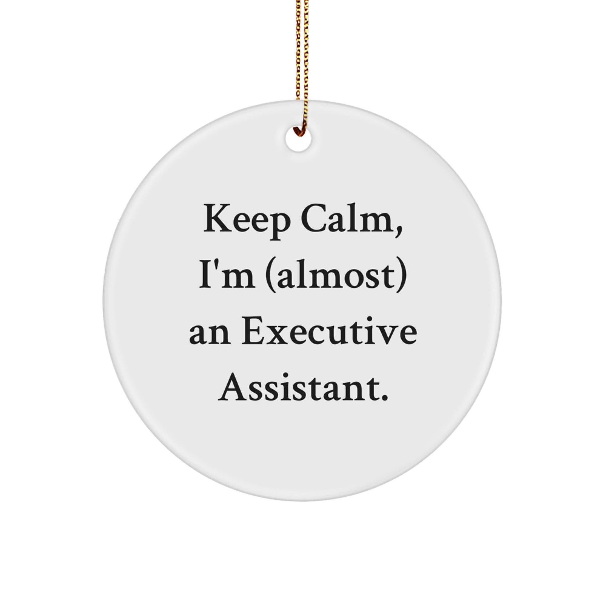 - Bring a touch of humor to your Executive Assistant's office space with this funny circle ornament, featuring the witty quote 'Keep Calm, I'm (almost) An Executive Assistant.' - a great gift for any executive assistant, whether you're shopping for men or women.