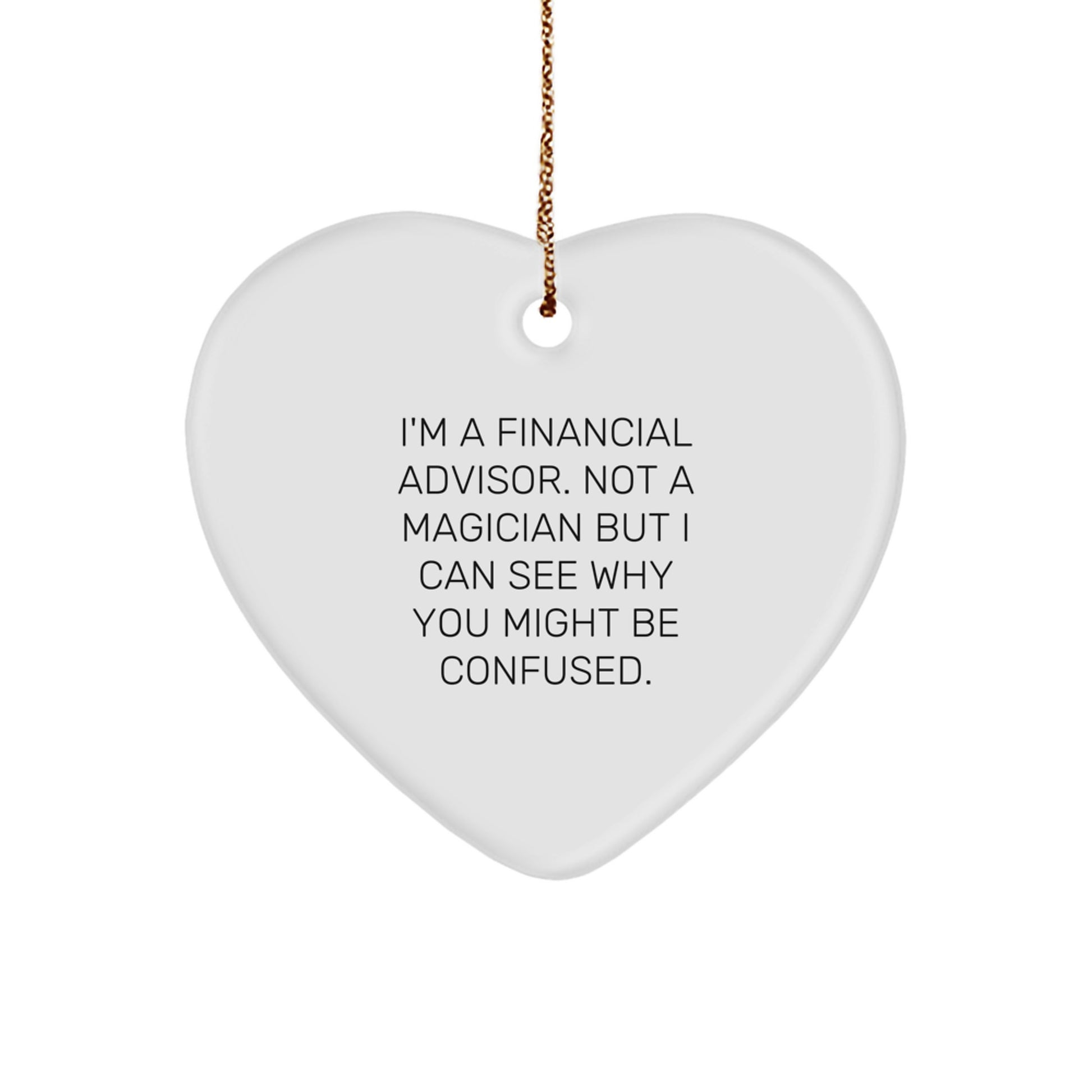 - This heart-shaped ornament is a unique and thoughtful gift for any Financial Advisor, featuring the quote 'I'm A Financial Advisor. Not A Magician But I Can See Why You Might Be Confused.' in a fun and quirky way.
