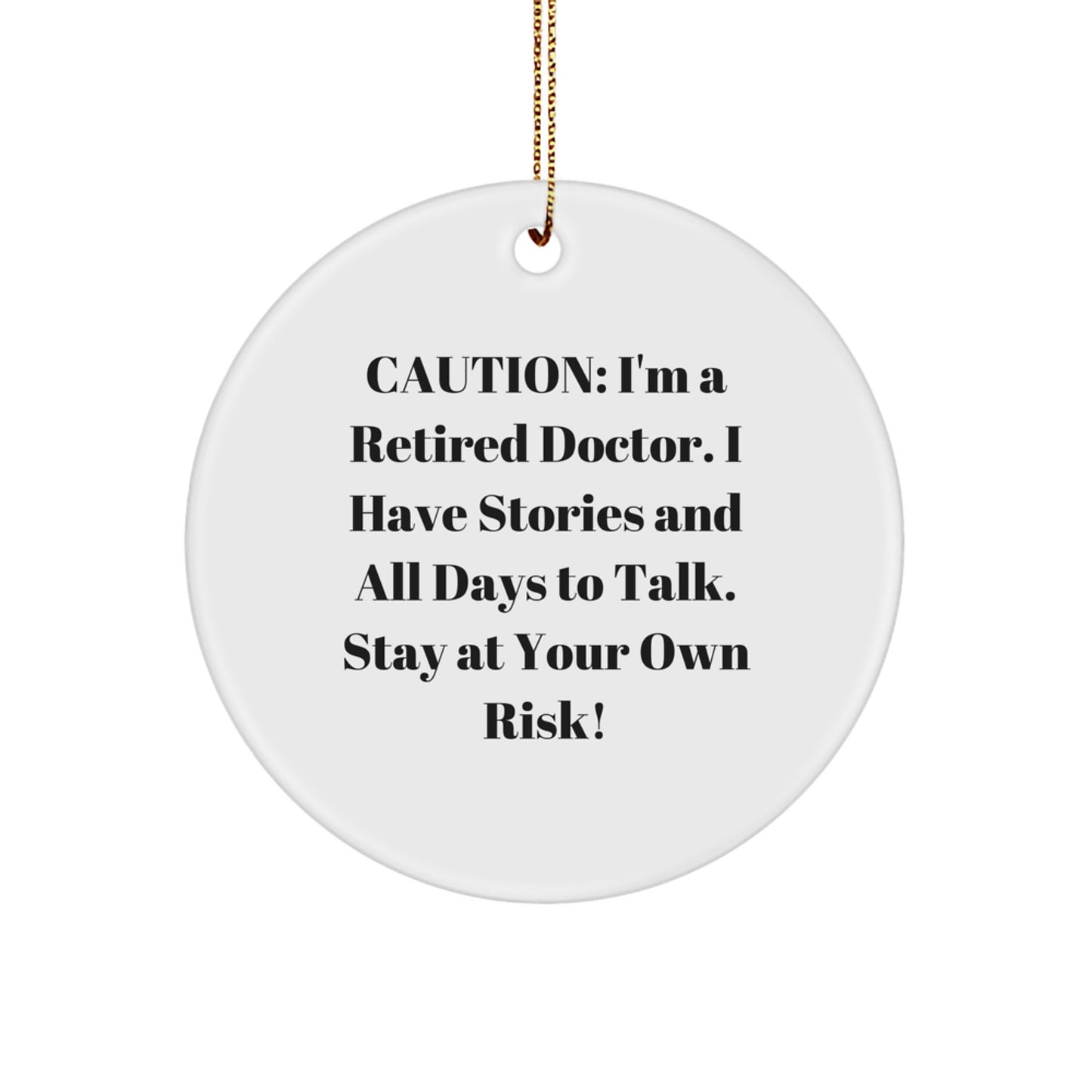 - Our Circle Ornament is a thoughtful gift for any Doctor, celebrating their hard work and dedication to the medical field. The lightweight and resistant design makes it easy to hang anywhere, and the festive gold cord adds a touch of elegance. Give the gift of laughter and joy with our unique and funny 'I'm A Retired Doctor, I Have Stories And All Days To Talk' Circle Ornament.
