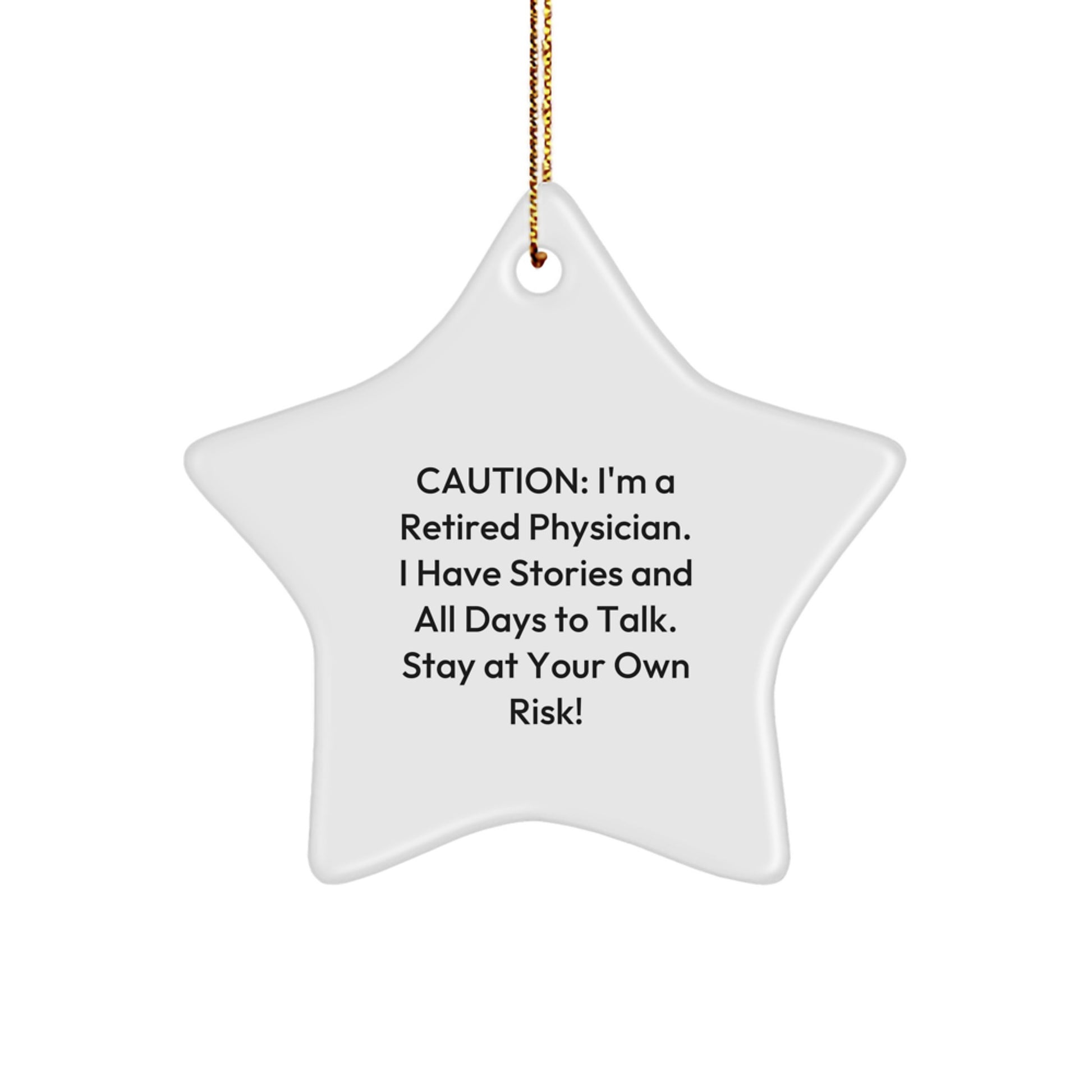 This star ornament features a quote that will make any retired physician laugh: 'Caution: I'm A Retired Physician. I Have Stories And All Days To Talk. Stay At Your Own Risk!' It's the perfect way to celebrate a physician's career and sense of humor.