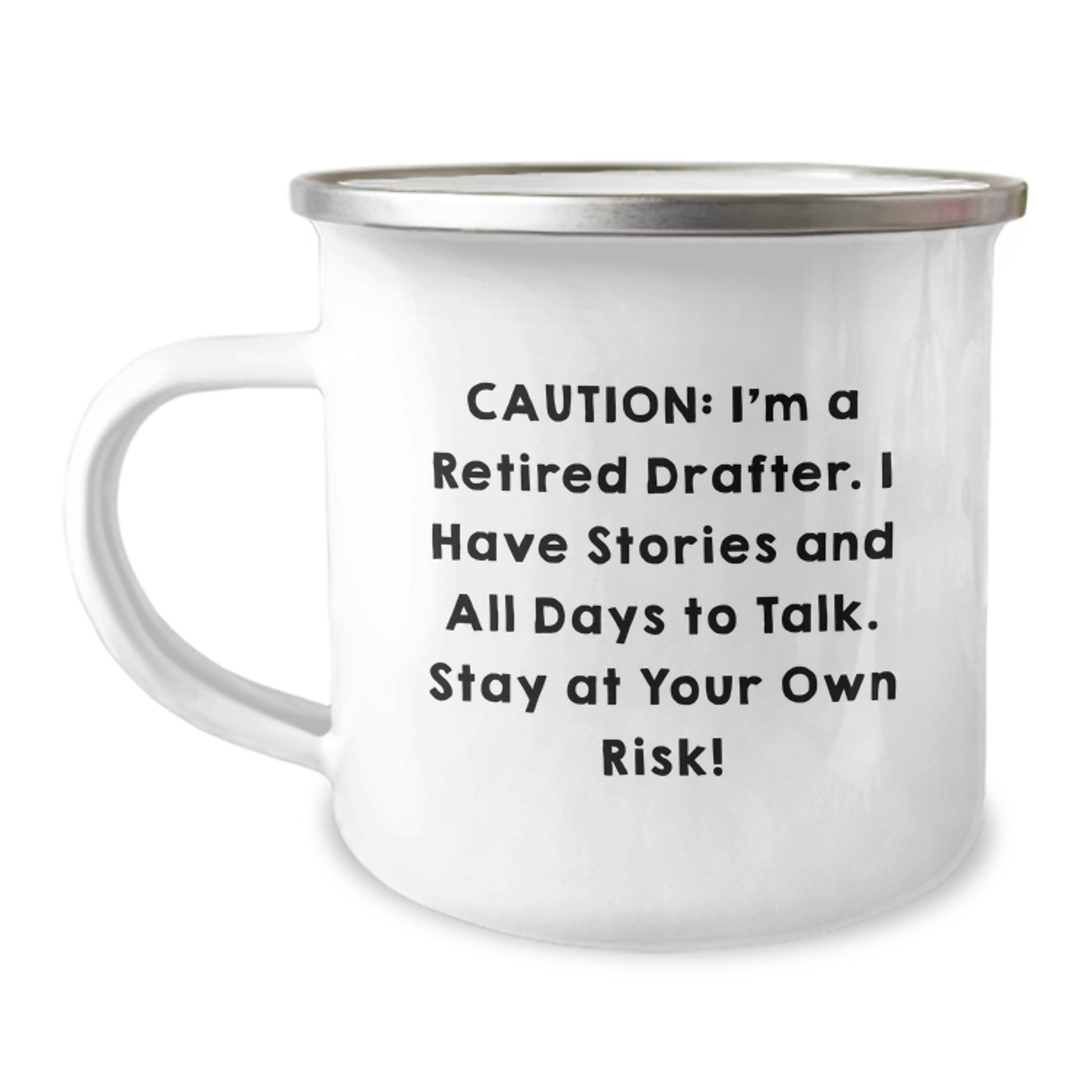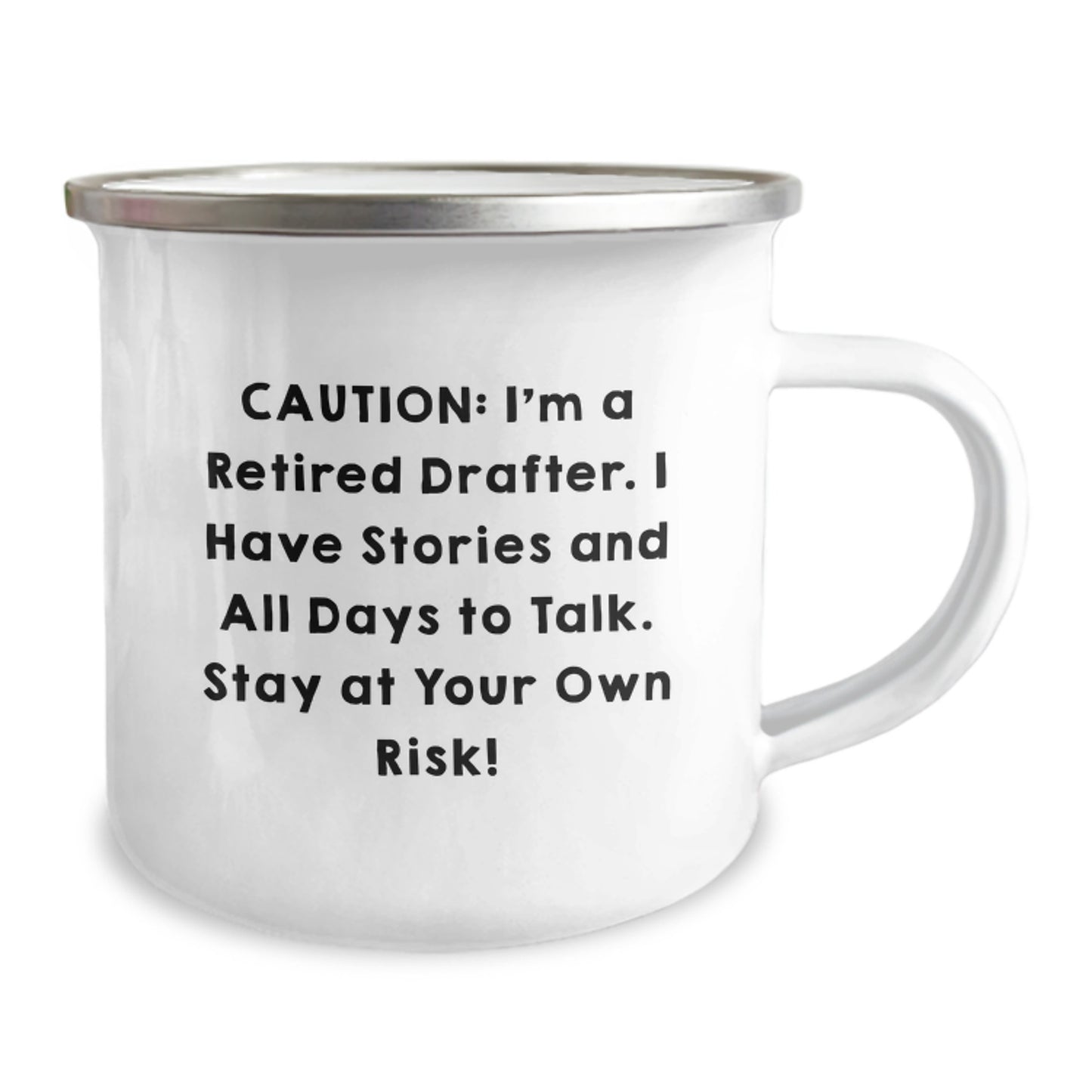 - This funny Camping Mug is the ideal gift for a retired Drafter who has stories to tell and days to talk. With its 12 oz capacity and stainless steel with enamel finish, it's built to last and features permanent printing that won't fade after washing.
