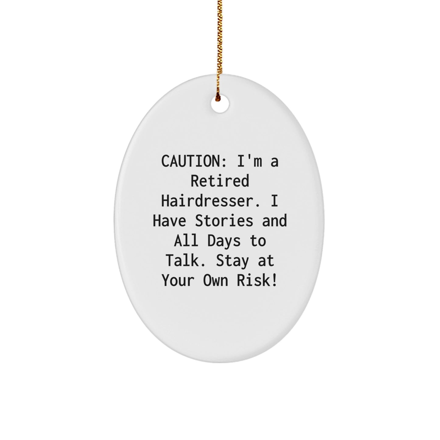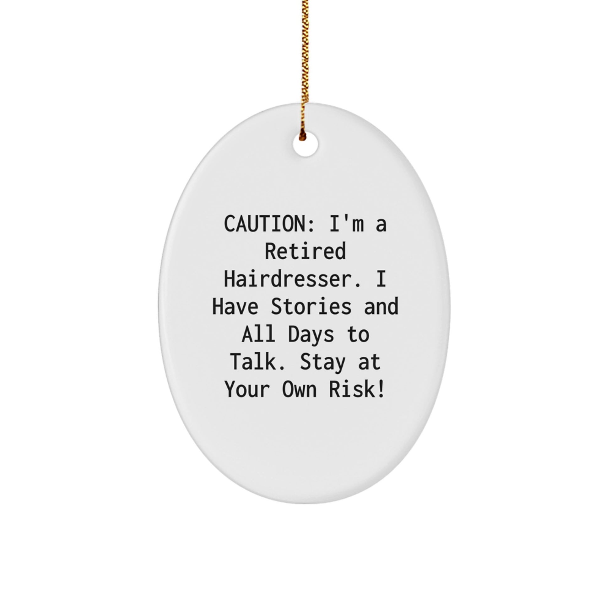 Are you a Hairdresser enthusiast or know someone who is? Look no further! Our unique Oval Ornament is the perfect way to showcase your personality and love for the Hairdresser profession. The quote 'Caution: I'm A Retired Hairdresser. I Have Stories And All Days To Talk. Stay At Your Own Risk!' is a humorous warning that any Hairdresser will appreciate, making it a great gift for friends, family, or colleagues who share your passion.