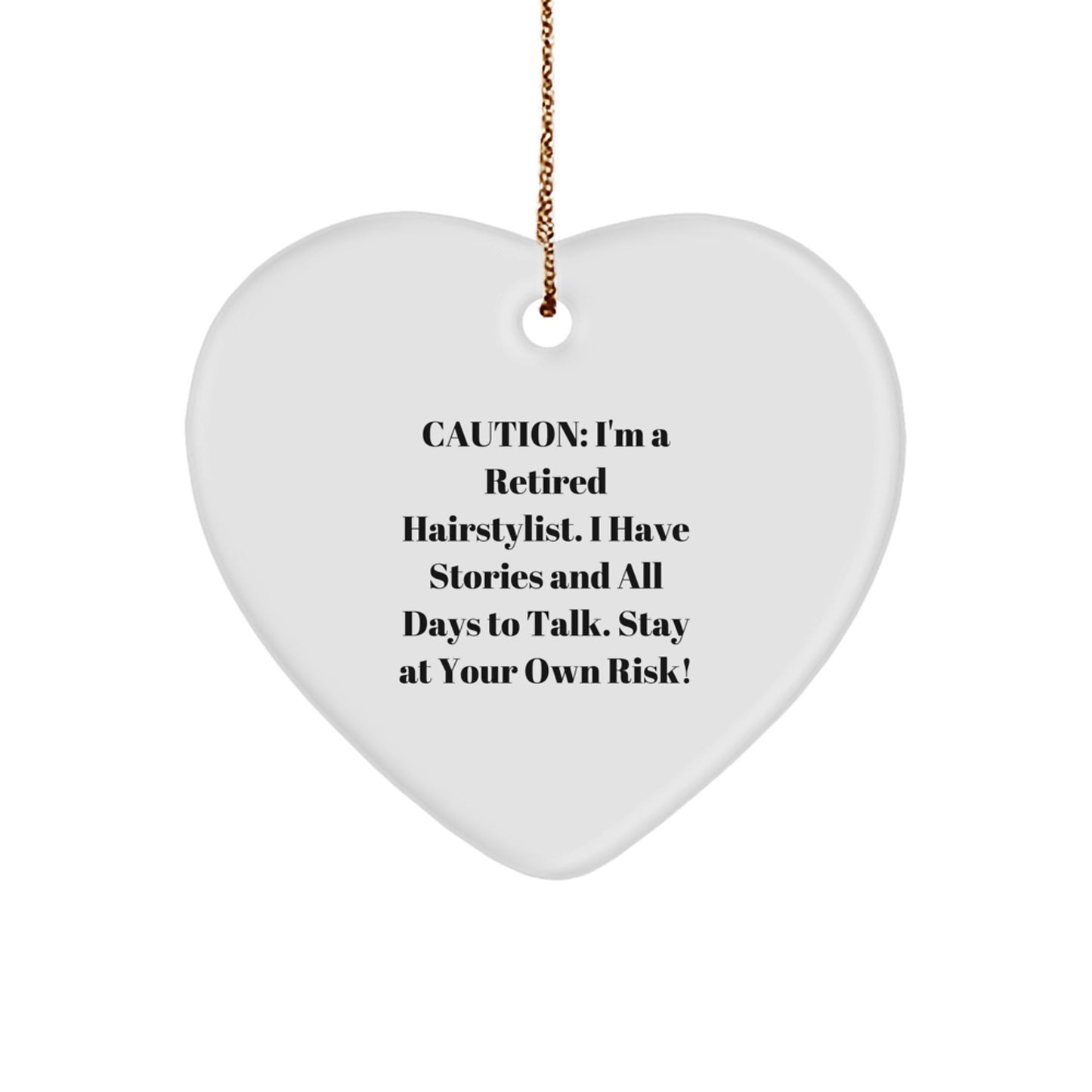 Are you a Hairstylist enthusiast or know someone who is? Look no further, we've got a unique gift for you! Introducing our Heart Ornament featuring a quote that will strike a chord with any Hairstylist: Caution: I'm A Retired Hairstylist. I Have Stories And All Days To Talk. Stay At Your Own Risk! This heartwarming phrase is a testament to the countless hours Hairstylists spend perfecting their craft and the joy they bring to their clients.