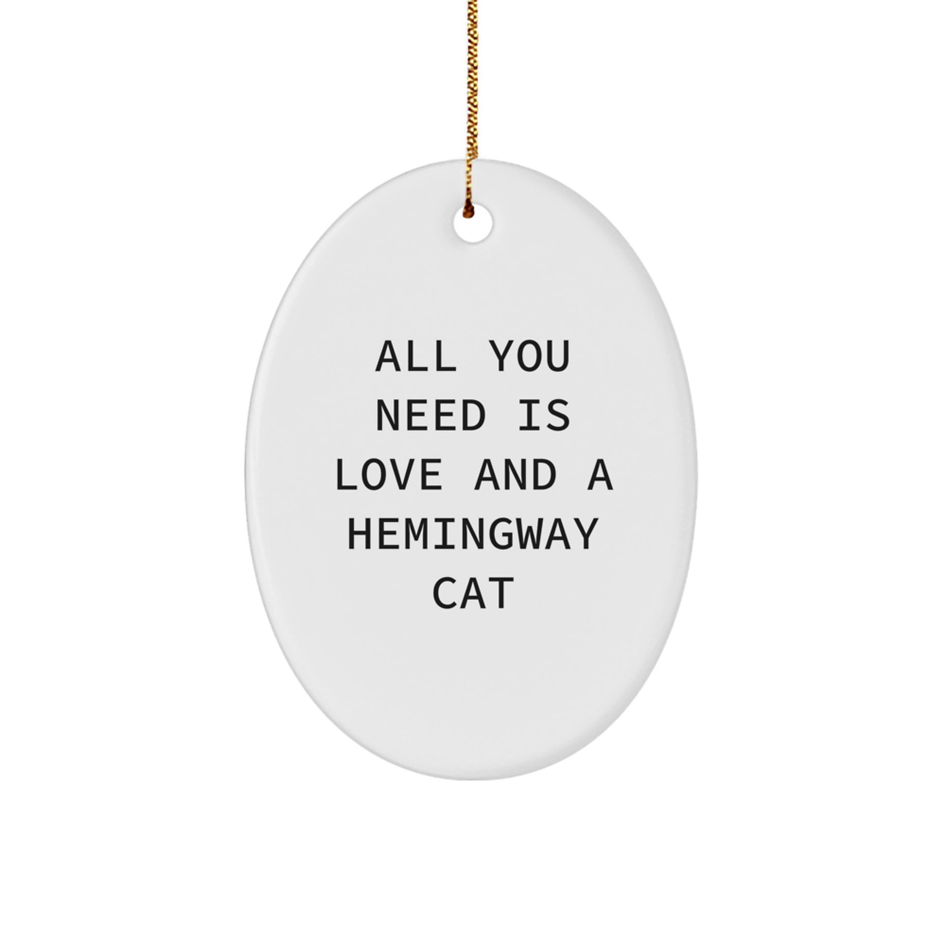 - This Hemingway Cat oval ornament is a thoughtful and unique gift for friends, family, or coworkers who love cats. The quote 'All You Need Is Love And A Hemingway Cat' is a fun and humorous way to express your affection for these adorable animals.
