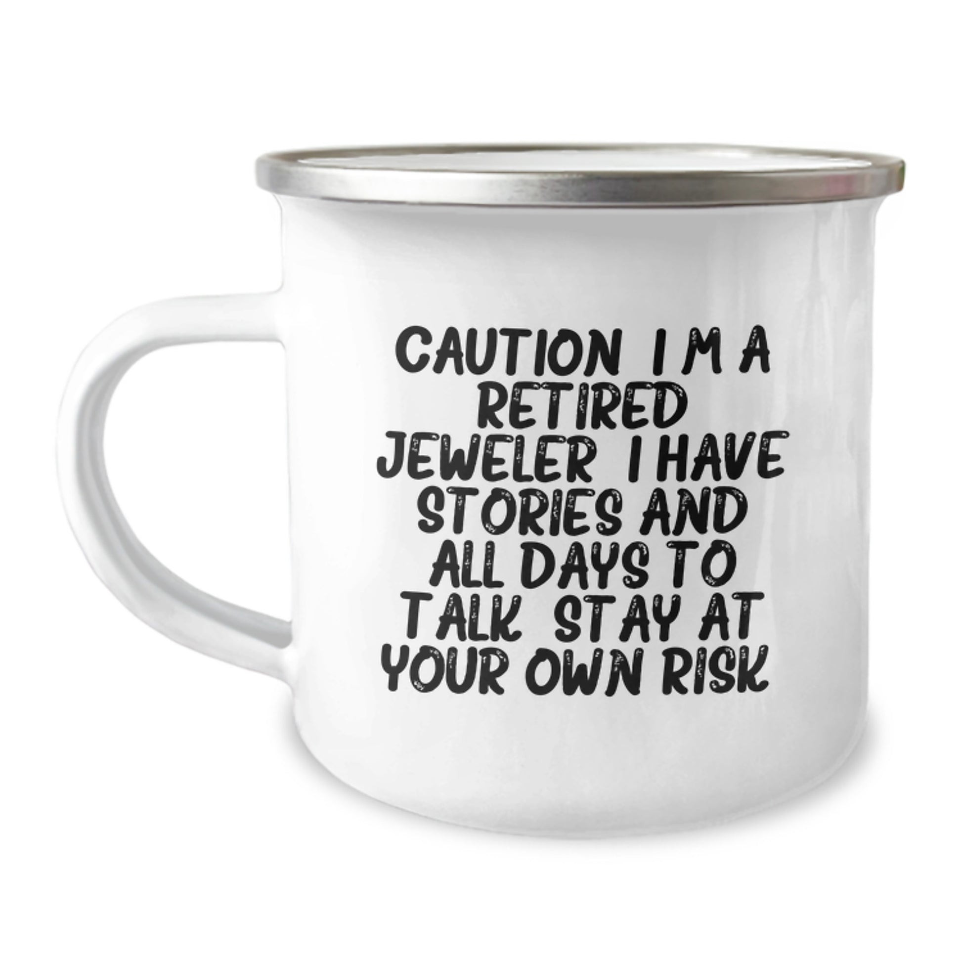 - This unique gift is perfect for any occasion, whether it's Christmas or just a regular day. Our 'Caution: I'm A Retired Jeweler. I Have Stories And All Days To Talk. Stay At Your Own Risk!' Camping Mug is the perfect way to show your favorite Jeweler that you care.