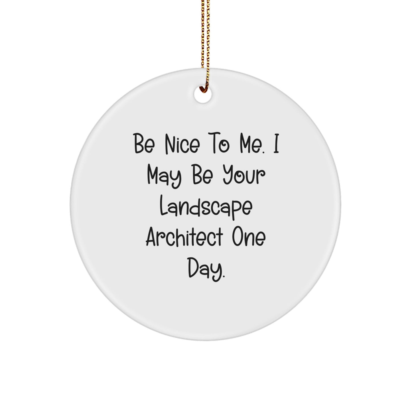 Are you looking for a unique gift for the Landscape Architect in your life? Look no further! This Circle Ornament is a thoughtful and humorous way to show your appreciation for their hard work and dedication. The quote 'Be Nice To Me. I May Be Your Landscape Architect One Day.' is a fun and lighthearted way to poke fun at the profession, making it a great addition to any landscape architect's office or home.