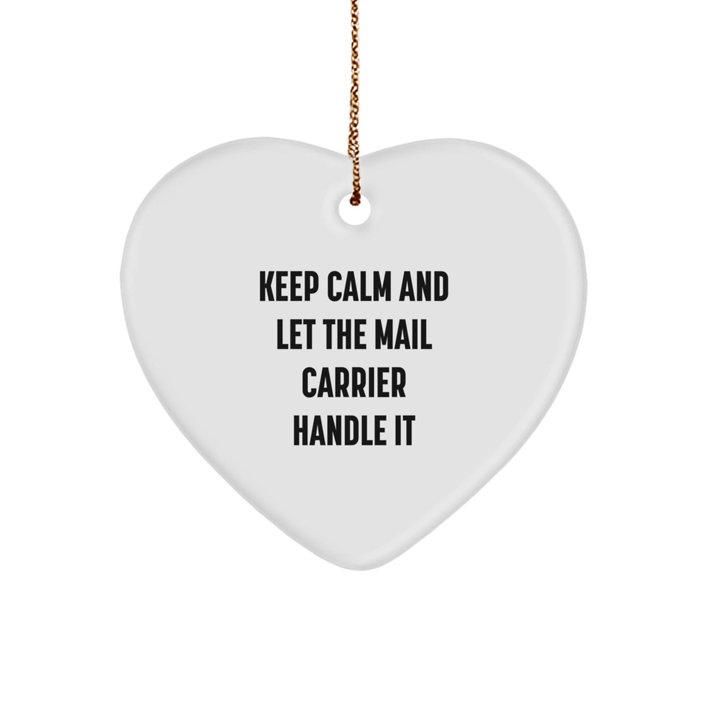 - Give the gift of appreciation to the Mail Carrier in your life with this 'Keep Calm And Let The Mail Carrier Handle It' Heart Ornament. Made from sturdy MDF with a high-gloss plastic finish, this ornament is lightweight, resistant to breaking, and vibrantly printed from edge-to-edge via Sublimation. Perfect for stress-free decorating, it ships with a festive gold cord for easy hanging.