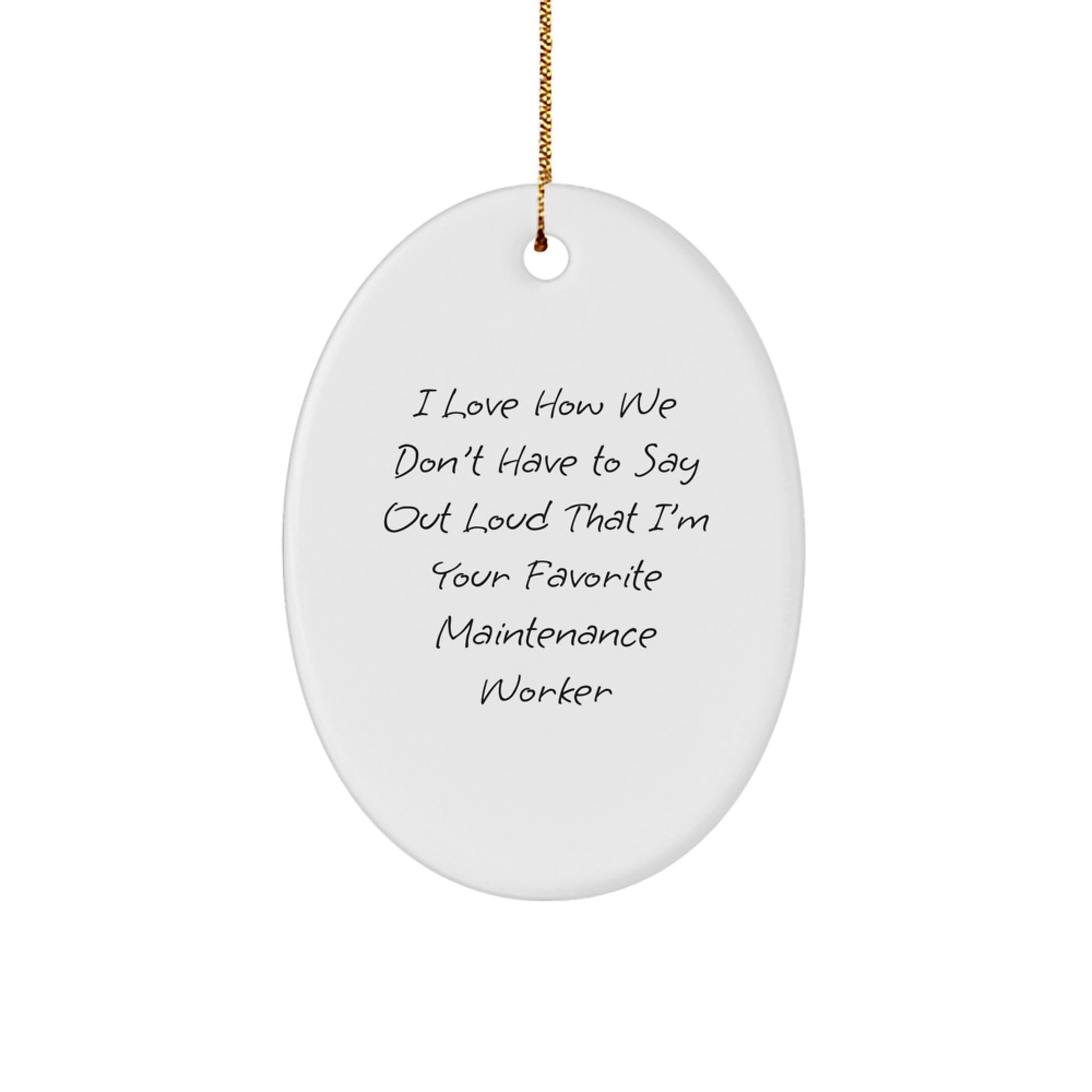 - Show your appreciation for the maintenance worker in your life with this unique oval ornament, featuring a quote that says 'I love how we don't have to say out loud that I'm your favorite maintenance worker' - a thoughtful and humorous way to acknowledge their hard work and dedication, measuring 3.25 inches tall, 1/8 inch thick, and crafted from durable MDF with a high-gloss plastic finish for long-lasting designs.
