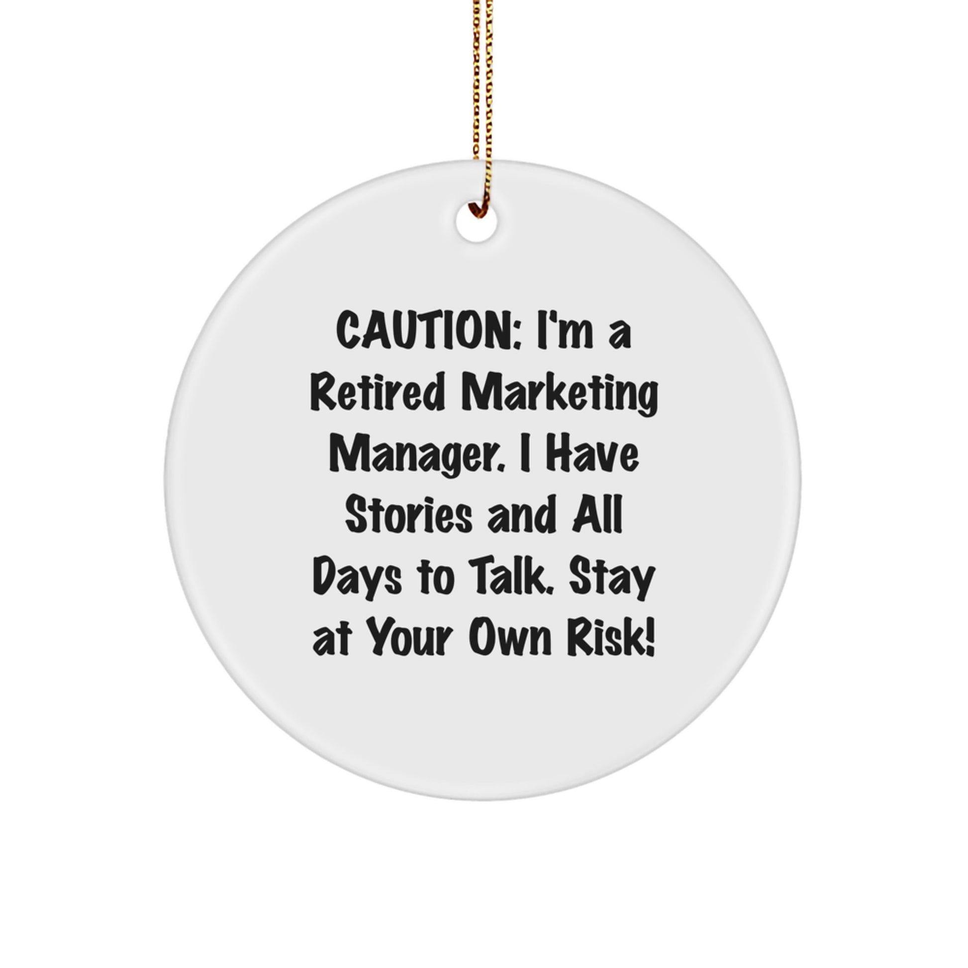 Are you looking for a unique gift for the marketing manager in your life? Look no further! This funny Christmas circle ornament is the perfect way to show your appreciation for their hard work and dedication. As a retired marketing manager, I have stories to tell and all day to talk - so stay at your own risk! This white circle-shaped ornament is made from sturdy MDF with a high-gloss plastic finish, ensuring long-lasting designs. The vibrant printing from edge-to-edge via sublimation ensures bright, vivid colors that will make a statement on any Christmas tree. Whether you're a coworker, friend, or family member, this ornament is the perfect way to show your marketing manager how much you care. So, get ready to deck the halls with this hilarious gift!