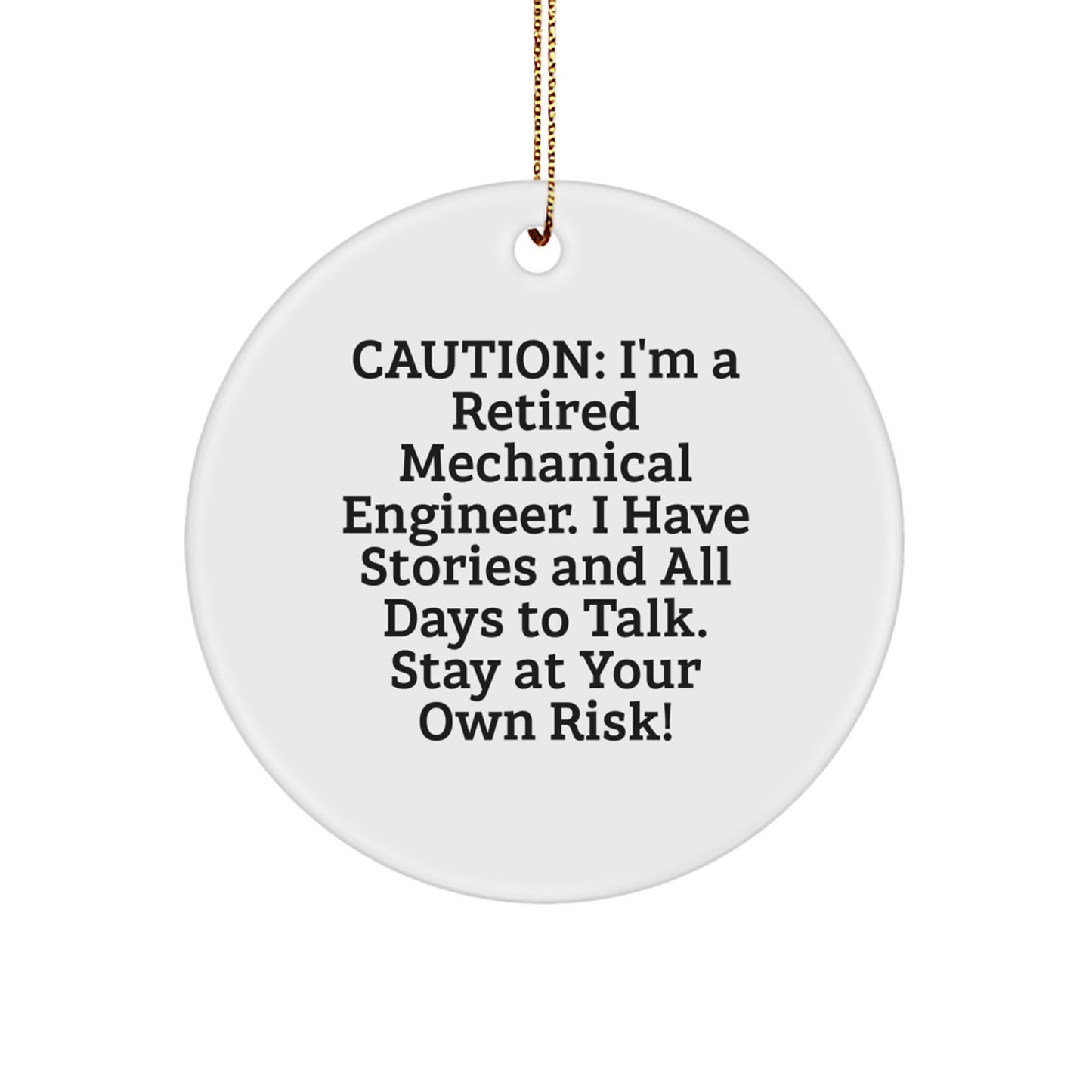 Are you a fellow Mechanical Engineer enthusiast or looking for a unique gift for the engineer in your life? Look no further! This Circle Ornament features a funny quote that will bring a smile to any Mechanical Engineer's face. 'Caution: I'm A Retired Mechanical Engineer. I Have Stories And All Days To Talk. Stay At Your Own Risk!' is the perfect addition to any Christmas tree or office decor. Made from sturdy MDF with a high-gloss plastic finish, this Circle Ornament is lightweight and resistant to breaking, making it perfect for households with children or pets. It's also vibrantly printed from edge-to-edge via Sublimation, ensuring bright, vivid colors. Whether you're looking for a gift for your coworker, friend, or family member, this Mechanical Engineer Circle Ornament is a great choice. So go ahead, order one today and bring some festive cheer to your loved ones!
