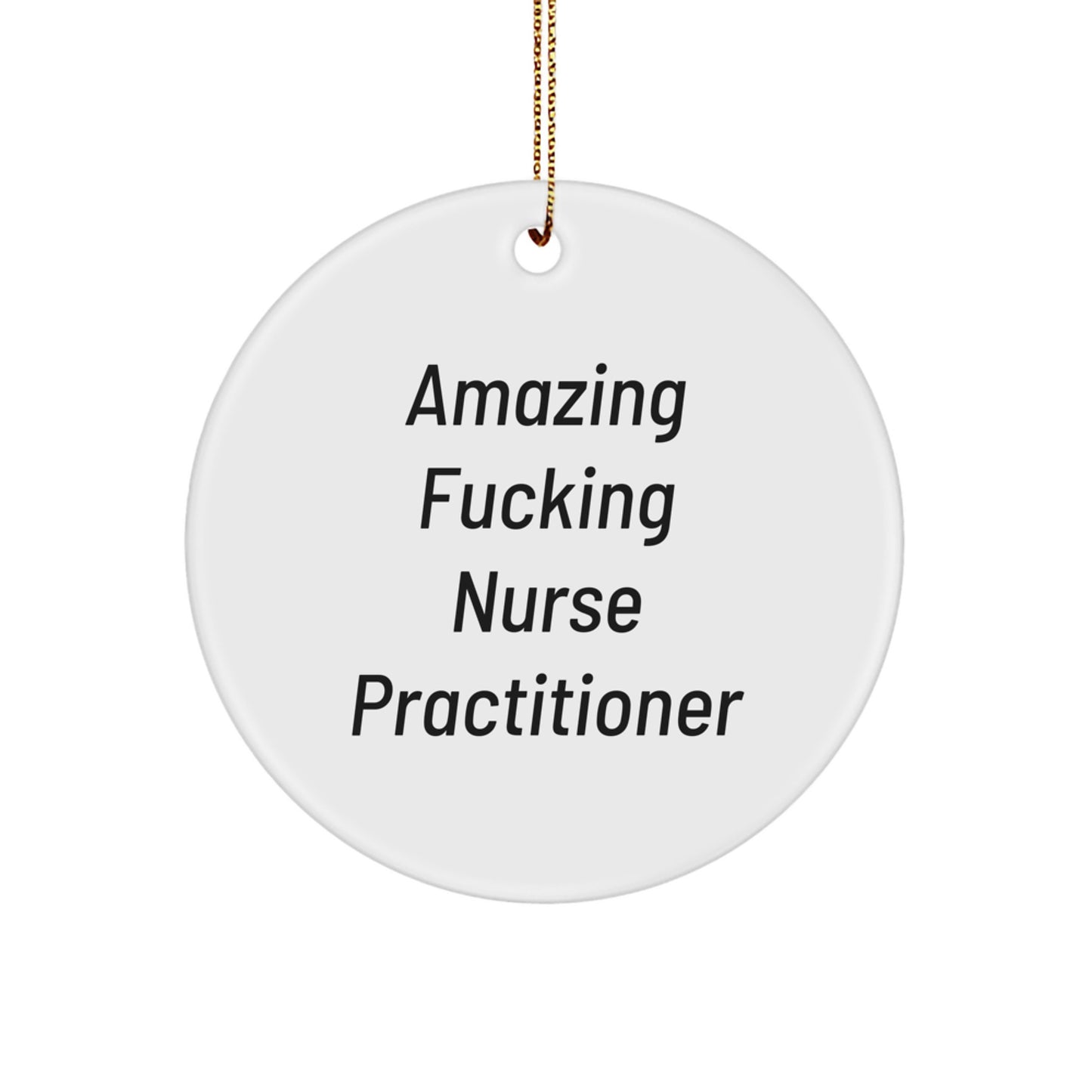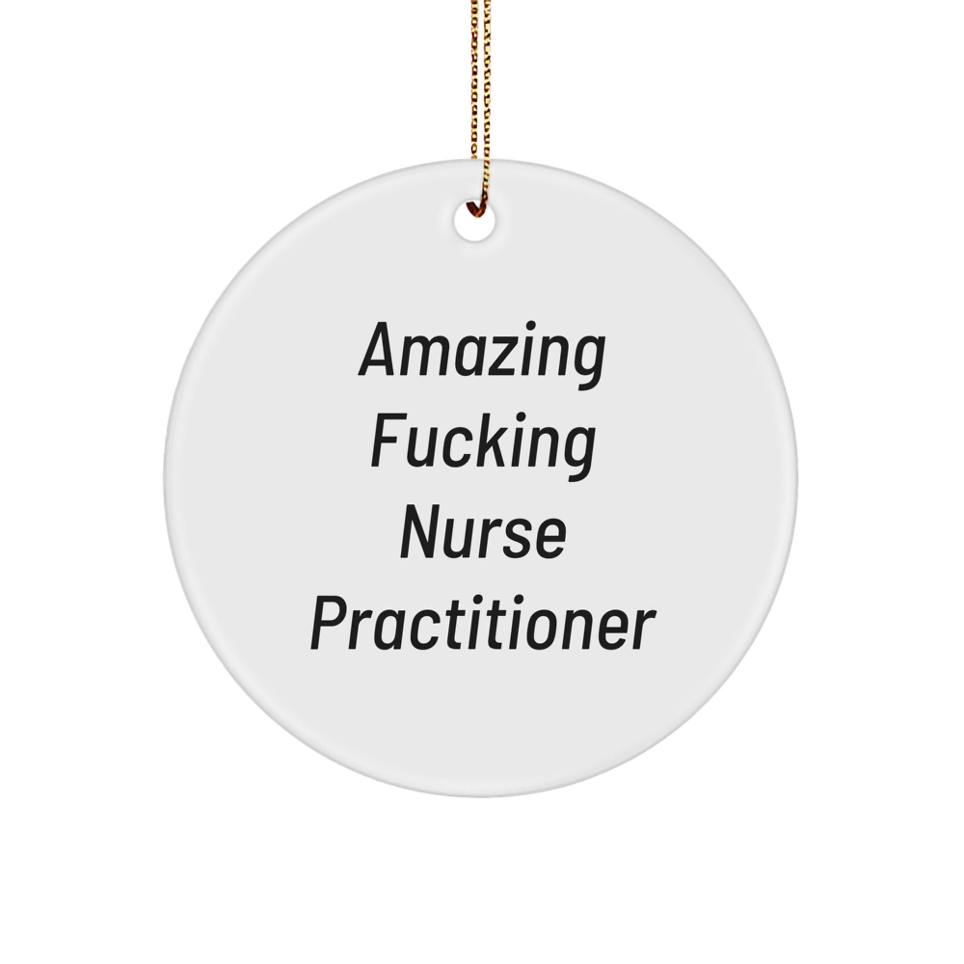 - Get the ideal gift for any Nurse Practitioner in your life with our Funny Nurse Practitioner Gifts from Friends for Christmas Unique Circle Ornament. Made from sturdy MDF and high-gloss plastic, this ornament is both long-lasting and easy to hang, and the vibrant colors will make it a standout on your tree. The 'Amazing F--king Nurse Practitioner' quote will bring a smile to their face and show your appreciation for all that they do.