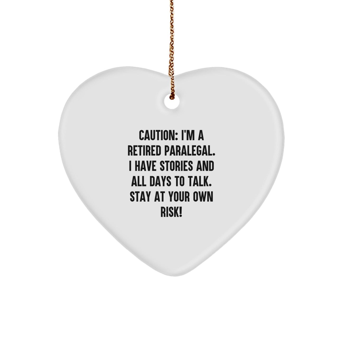 - This funny paralegal ornament is the ideal gift for any paralegal who enjoys a good laugh. The quote 'Caution: I'm A Retired Paralegal. I Have Stories And All Days To Talk. Stay At Your Own Risk!' is a hilarious way to poke fun at the paralegal profession. Made from sturdy MDF with a high-gloss plastic finish, this ornament is sure to last for years to come. It's also lightweight and resistant to breaking, making it a great choice for households with children or pets.