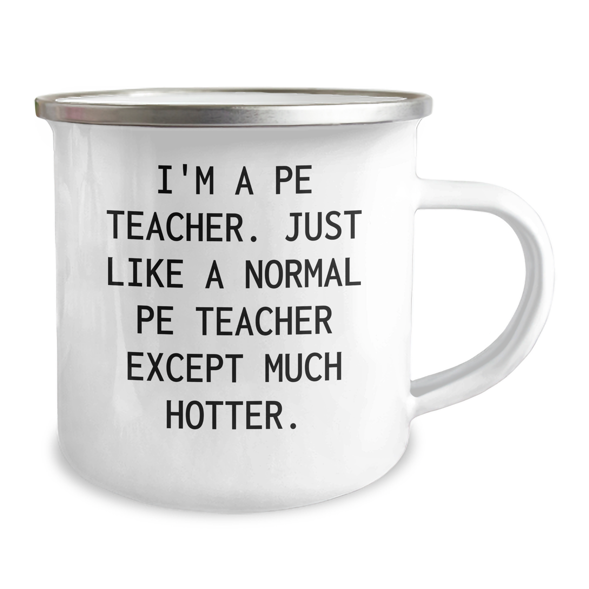 - Honor your favorite 'I'm A PE Teacher. Just Like A Normal PE Teacher Except Much Hotter.' with this unique camping mug, perfect for outdoor enthusiasts and PE teachers alike. Made from sturdy stainless steel with an enamel finish, this 12 oz mug is built to withstand the rigors of camping and hiking. Enjoy your favorite hot beverages on the go, and show off your PE teacher pride!
