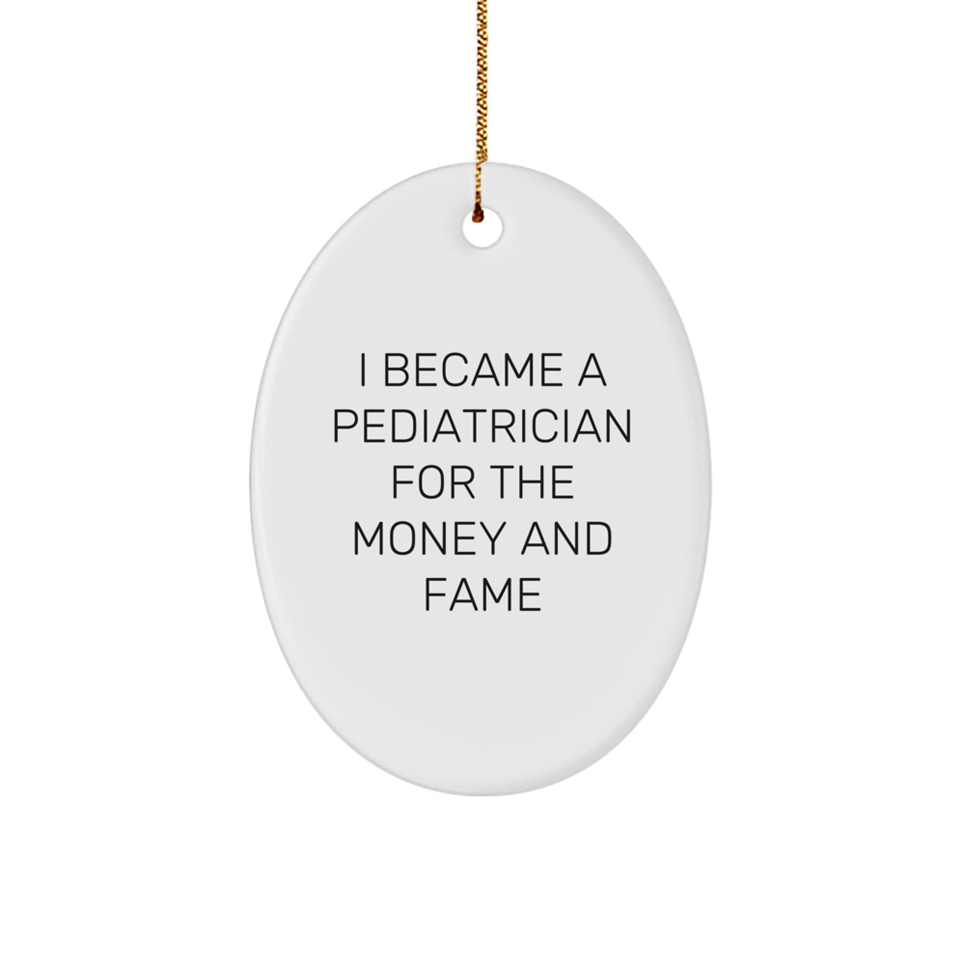 - The quote 'I became a pediatrician for the money and fame' is a humorous take on the profession, making it a great gift for anyone who knows a pediatrician. Perfect for Christmas or any occasion, this ornament is a unique and thoughtful gift for friends, family, or coworkers. Our oval ornament is a fun way to share your love and appreciation for pediatricians.