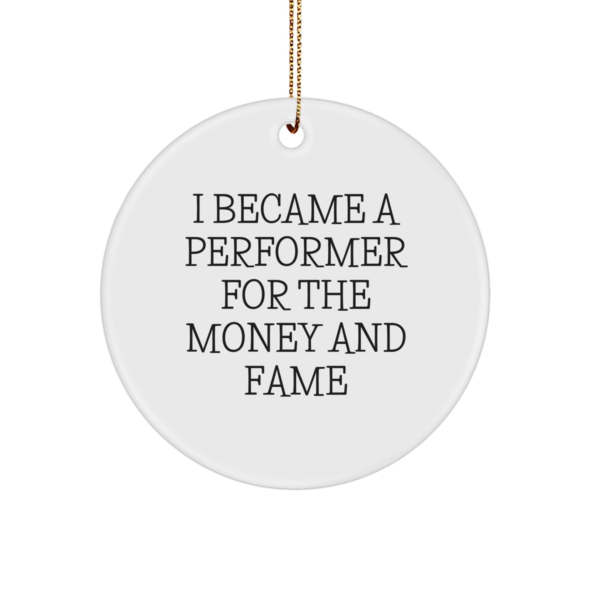 - Make anyone's day with this funny quote 'I Became A Performer For The Money And Fame' Circle Ornament, perfect for performers of all ages. This high-quality ornament is crafted from sturdy MDF with a high-gloss plastic finish and features a vibrant Sublimation print, making it a unique gift for friends, family, or coworkers.