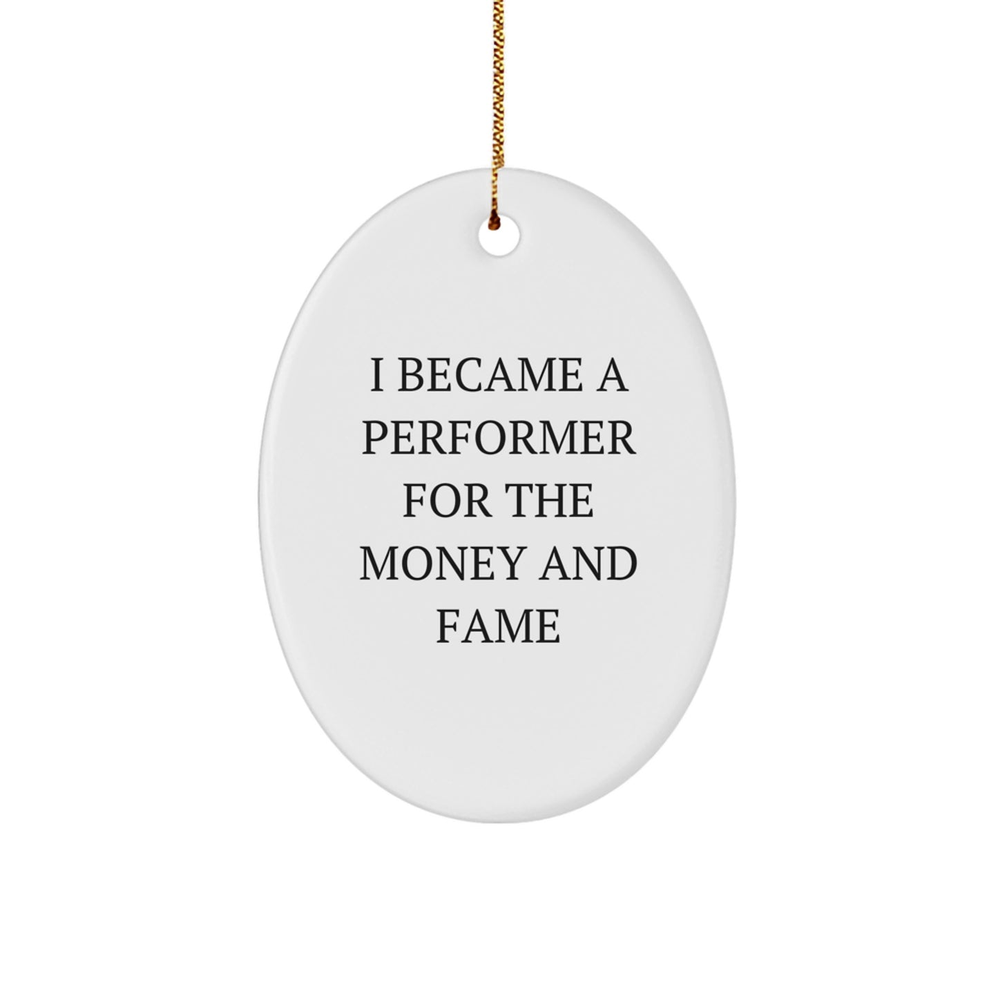 - This funny Oval Ornament is the ideal gift for any Performer enthusiast. It's a unique and thoughtful way to show your loved one that you care about their interests and hobbies. The quote 'I Became A Performer For The Money And Fame' is a hilarious and relatable phrase that's sure to bring a smile to their face. It's a great conversation starter and a unique way to decorate their home or office.