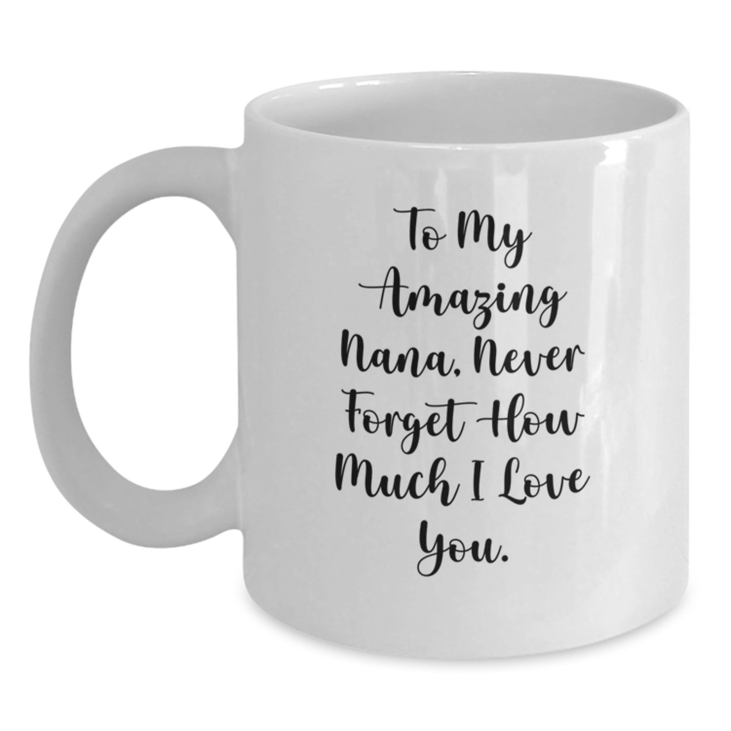 - Show your love and appreciation for your Nana with our Funny Personalized White Coffee Mug, featuring the quote 'To My Amazing Nana, Never Forget How Much I Love You.' This heartwarming message is sure to touch your Nana's heart and make her feel special.