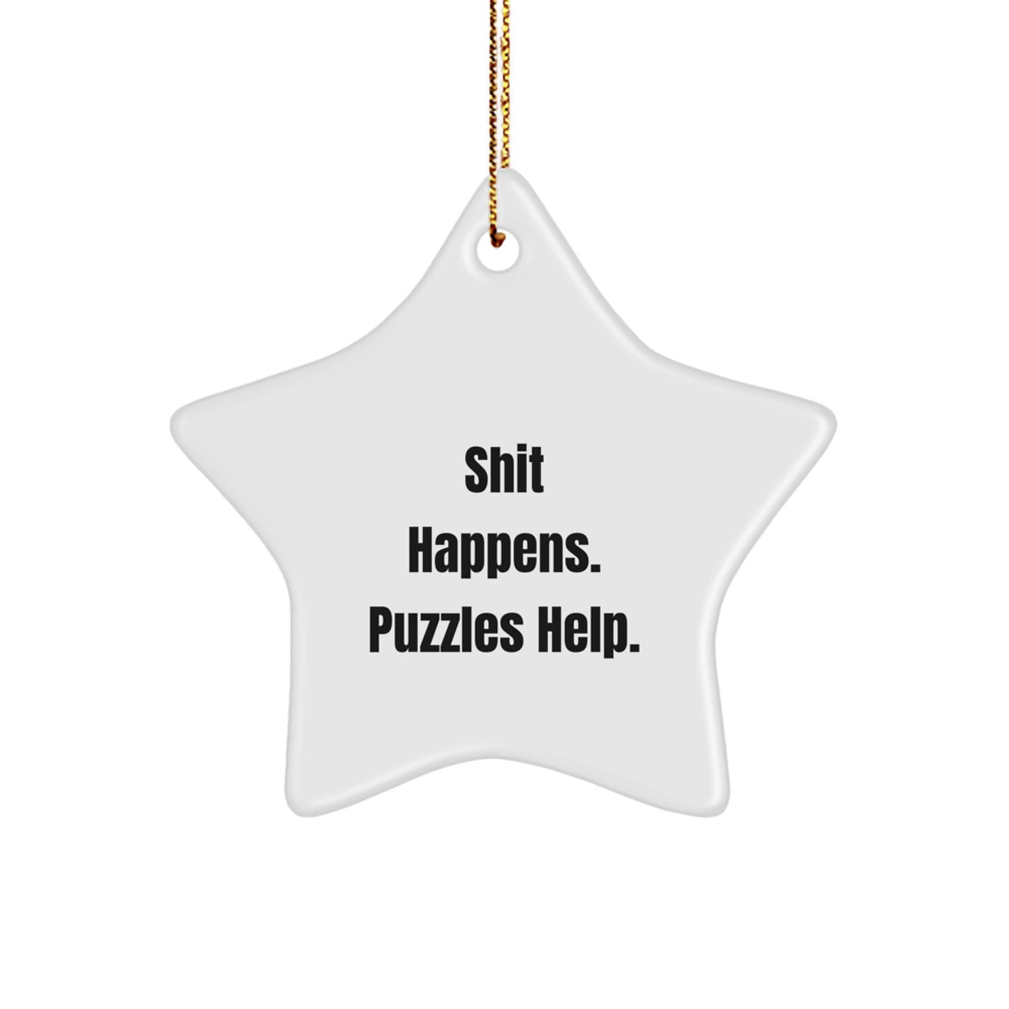 - Add some humor and personality to your holiday gift-giving with this 'Shit Happens. Puzzles Help.' Star Ornament, perfect for friends, family, or coworkers.