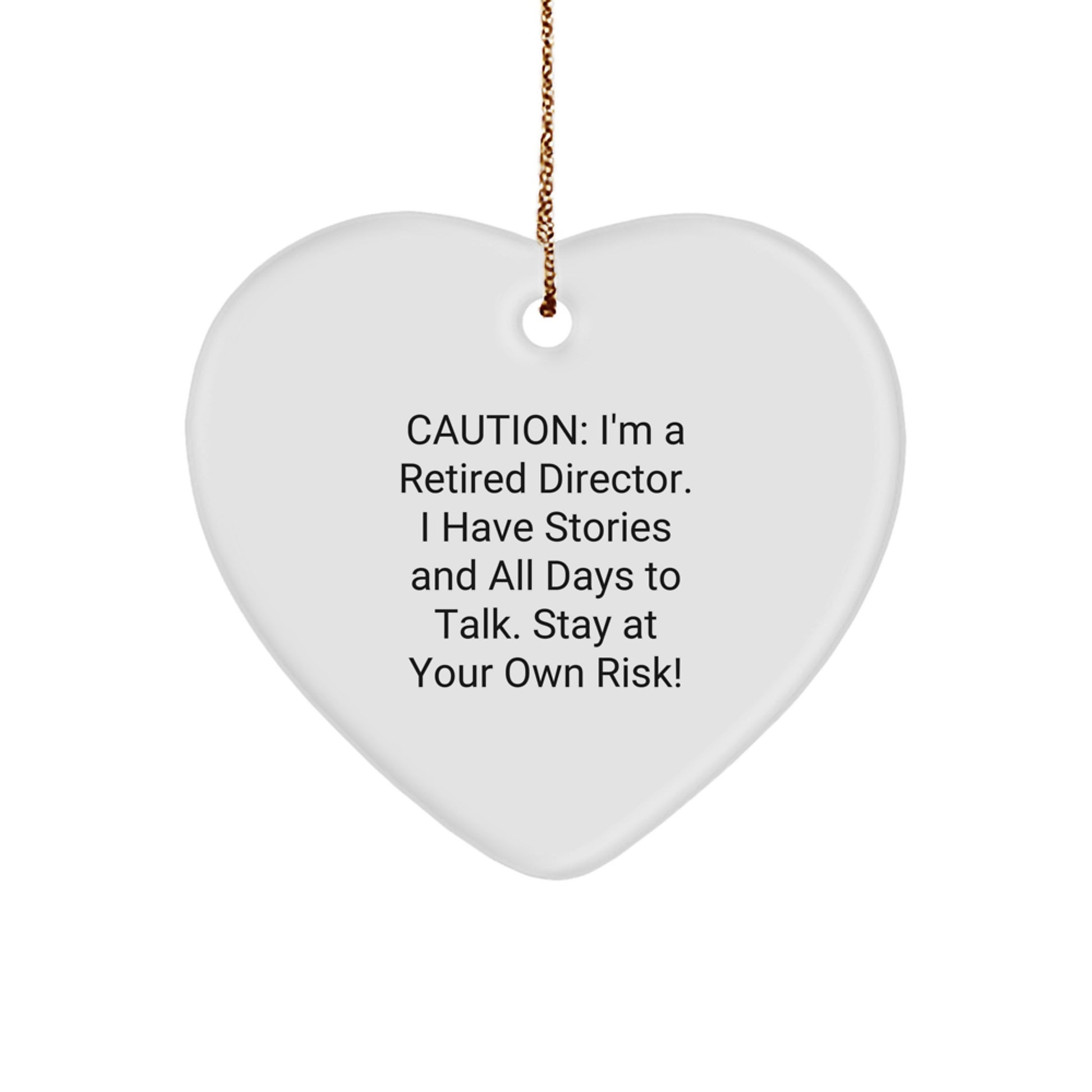 Caution: I'm A Retired Director. I Have Stories And All Days To Talk. Stay At Your Own Risk!' becomes a fun and playful warning for anyone brave enough to hang this ornament in their home. Whether you're a fan of the Director or just love a good laugh, this Heart Ornament is sure to bring a smile to your face.