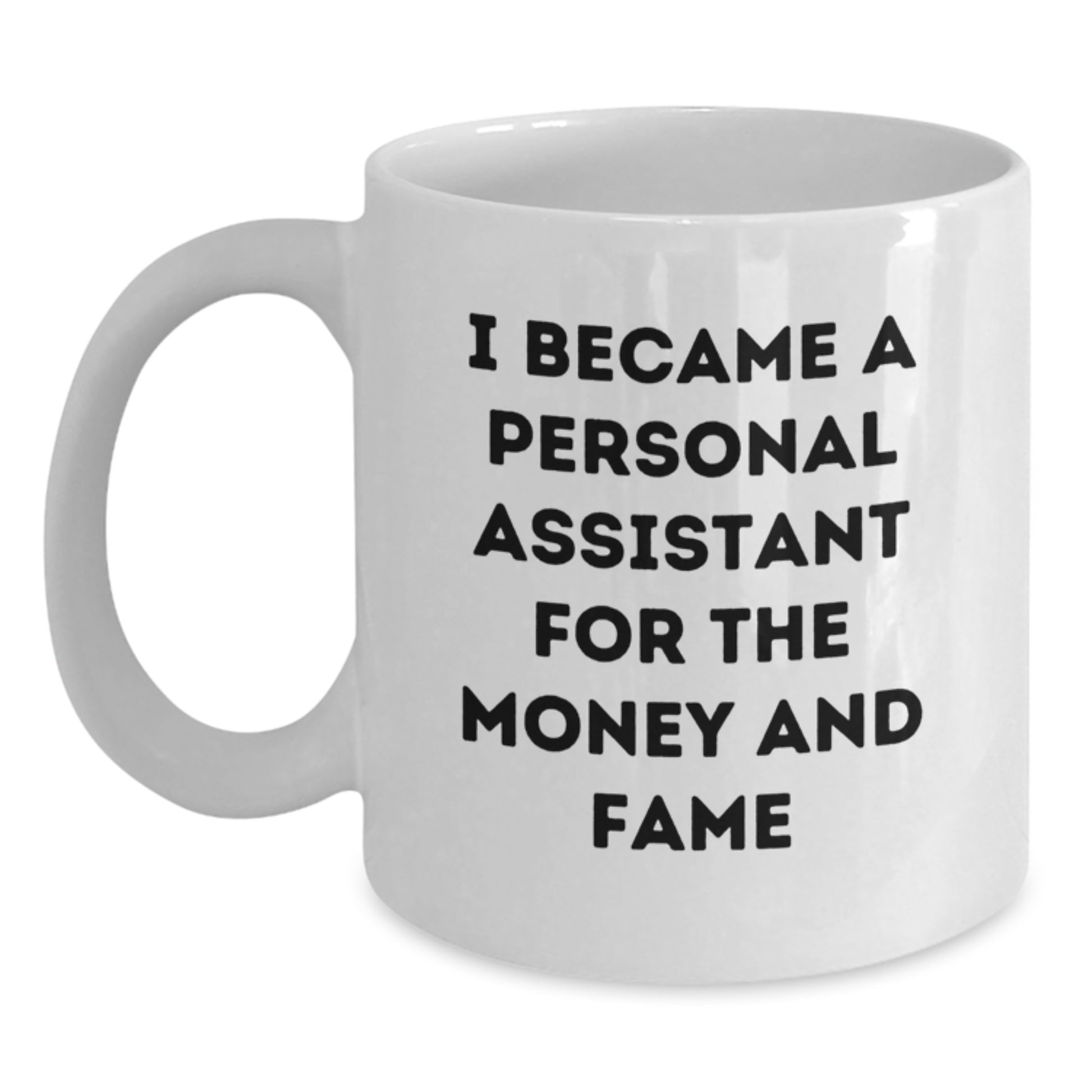 - The funny quote 'I Became A Personal Assistant For The Money And Fame' is sure to bring a smile to the face of anyone who sees it. It's a great way to add some humor and personality to your daily coffee routine. And with its high-quality ceramic construction, this mug is sure to last for a long time.