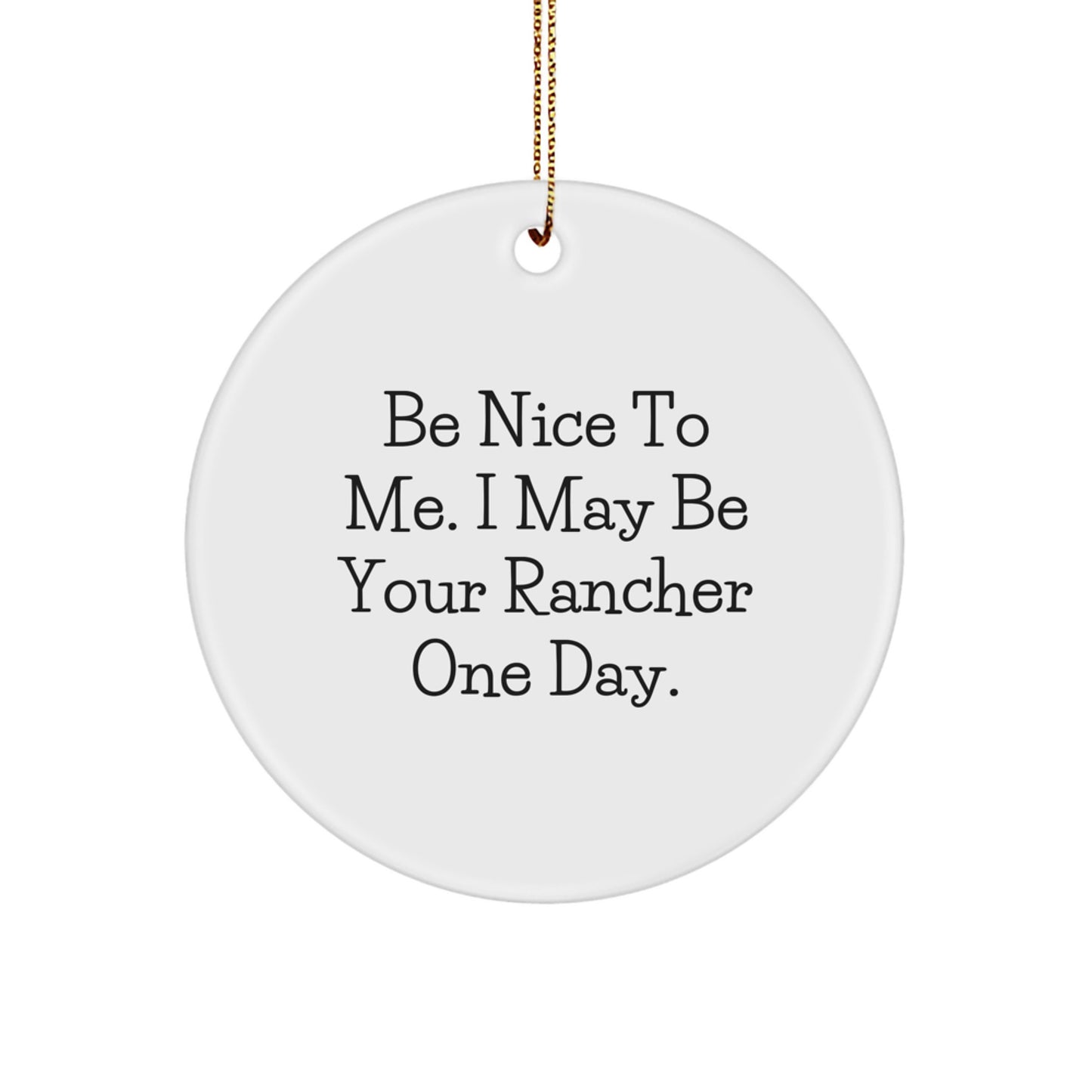 - Each of our circle ornaments is carefully crafted with a funny quote 'Be Nice To Me. I May Be Your Rancher One Day.' that is sure to bring a smile to the face of any rancher. Whether you're giving it as a gift for Christmas or just because, this ornament is sure to be a hit.