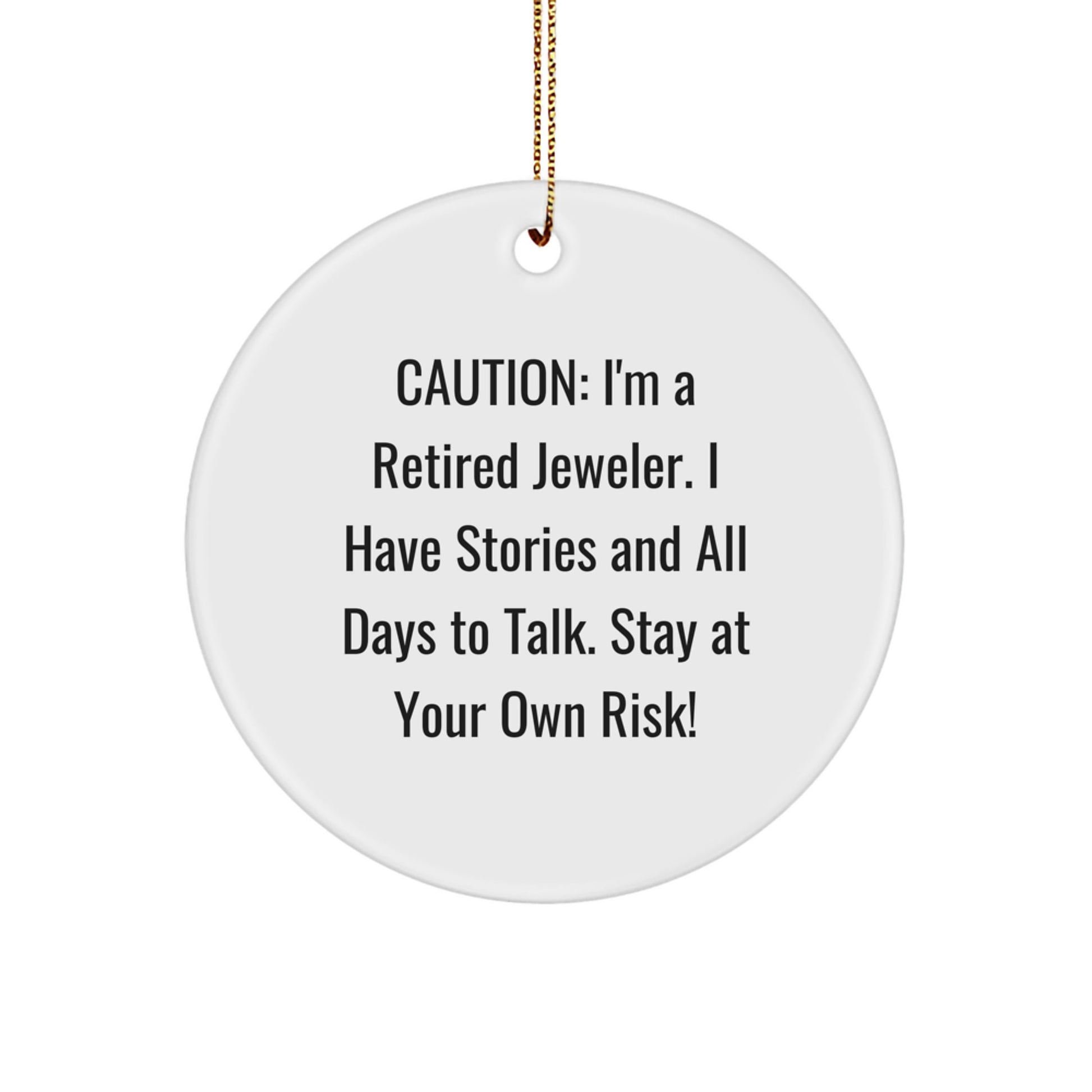 - Our Funny Retired Jeweler Circle Ornament is the ideal gift for Jeweler enthusiasts, featuring a unique design that's sure to bring a smile to their face. Made from sturdy MDF, this ornament is crafted to last and features a high-gloss plastic finish for long-lasting bright colors.