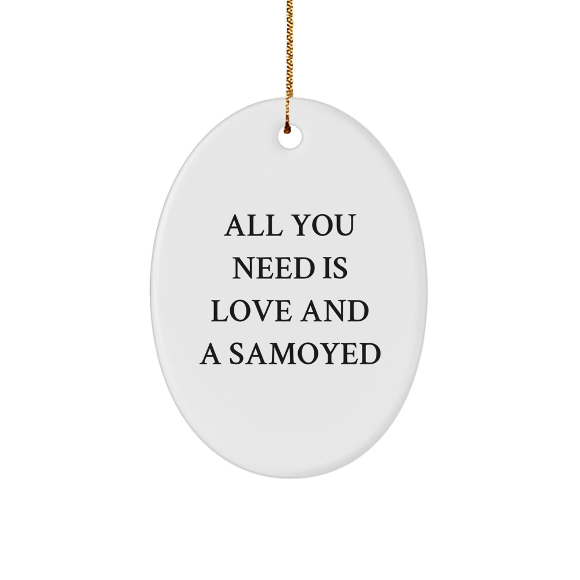 - Make a thoughtful gift for Samoyed Dog lovers with this 'All You Need Is Love And A Samoyed' Oval Ornament. Perfect for decorating your home or office during the holiday season, this beautiful ornament is sure to be a hit. Made from sturdy MDF with a high-gloss plastic finish, it's lightweight and resistant to breaking, making it ideal for households with children or pets.