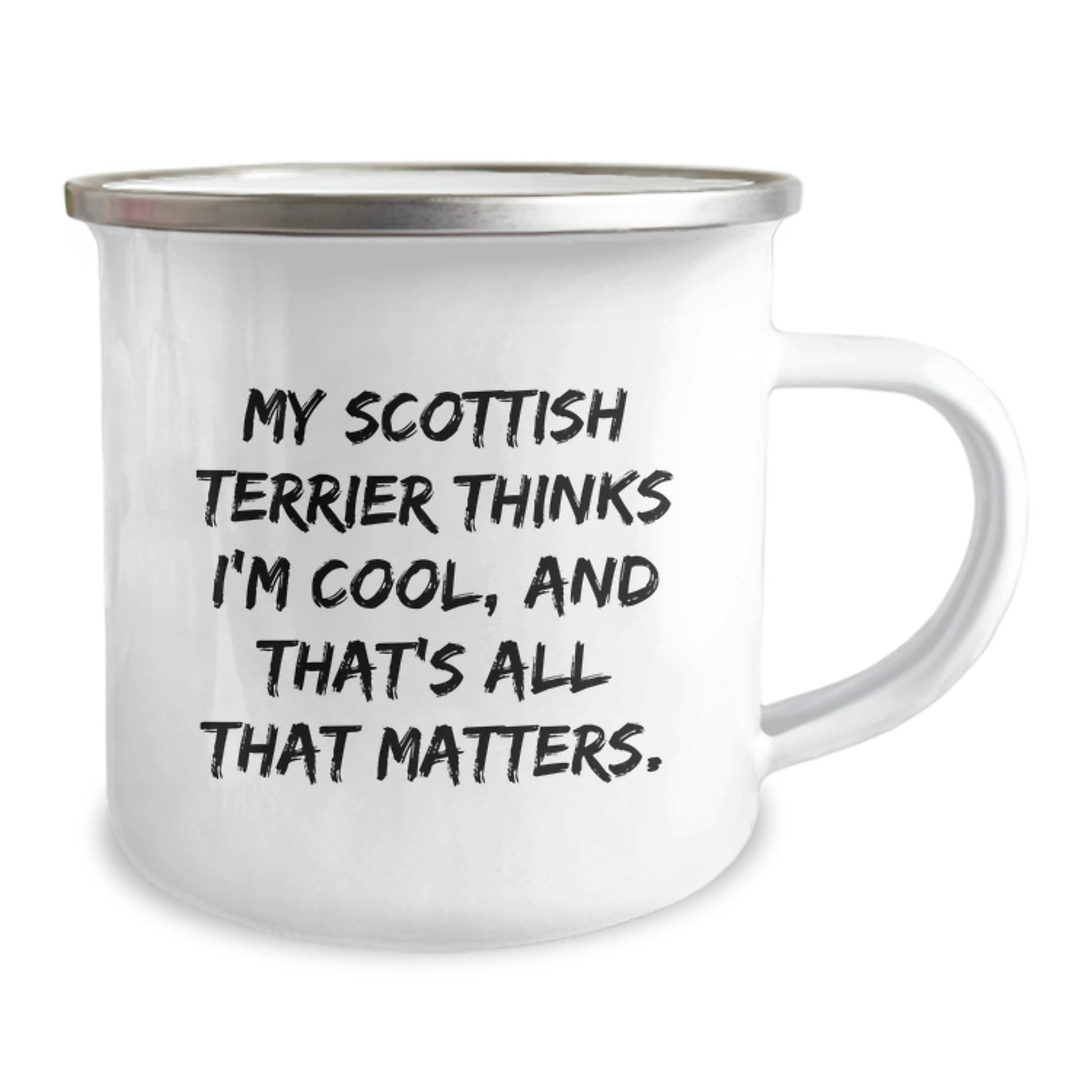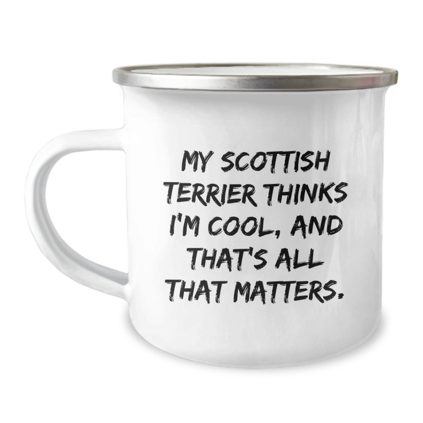 Are you a Scottish Terrier Dog enthusiast or looking for a unique gift for a Scottish Terrier Dog lover? This funny mug is the perfect way to show your love and appreciation. The quote 'My Scottish Terrier Thinks I'm Cool, And That's All That Matters' is sure to bring a smile to anyone's face. This camping mug is made of stainless steel with an enamel finish, making it sturdy and easy to clean. The permanent printing won't fade after washing, ensuring your design remains vibrant for a long time. Give this thoughtful gift to your friends, family, or coworkers who love Scottish Terrier Dogs. It's a great way to celebrate their special day or any occasion. So, don't wait, get this hilarious mug today and make someone's day brighter!