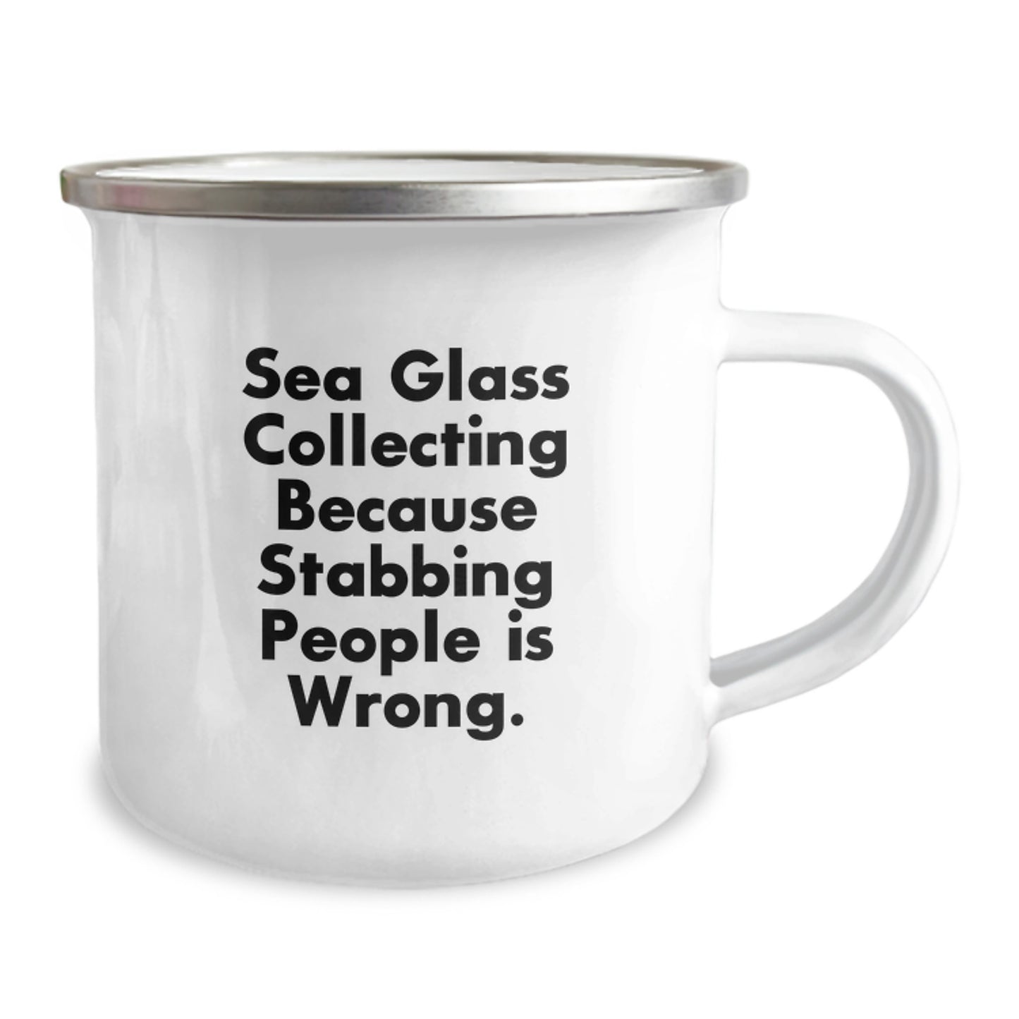 - This funny camping mug is the ideal gift for the sea glass enthusiast in your life. Made of high-quality stainless steel with an enamel finish, this 12 oz capacity mug is perfect for hot or cold beverages. The permanent printing won't fade after washing, ensuring your quote stays looking great for years to come.