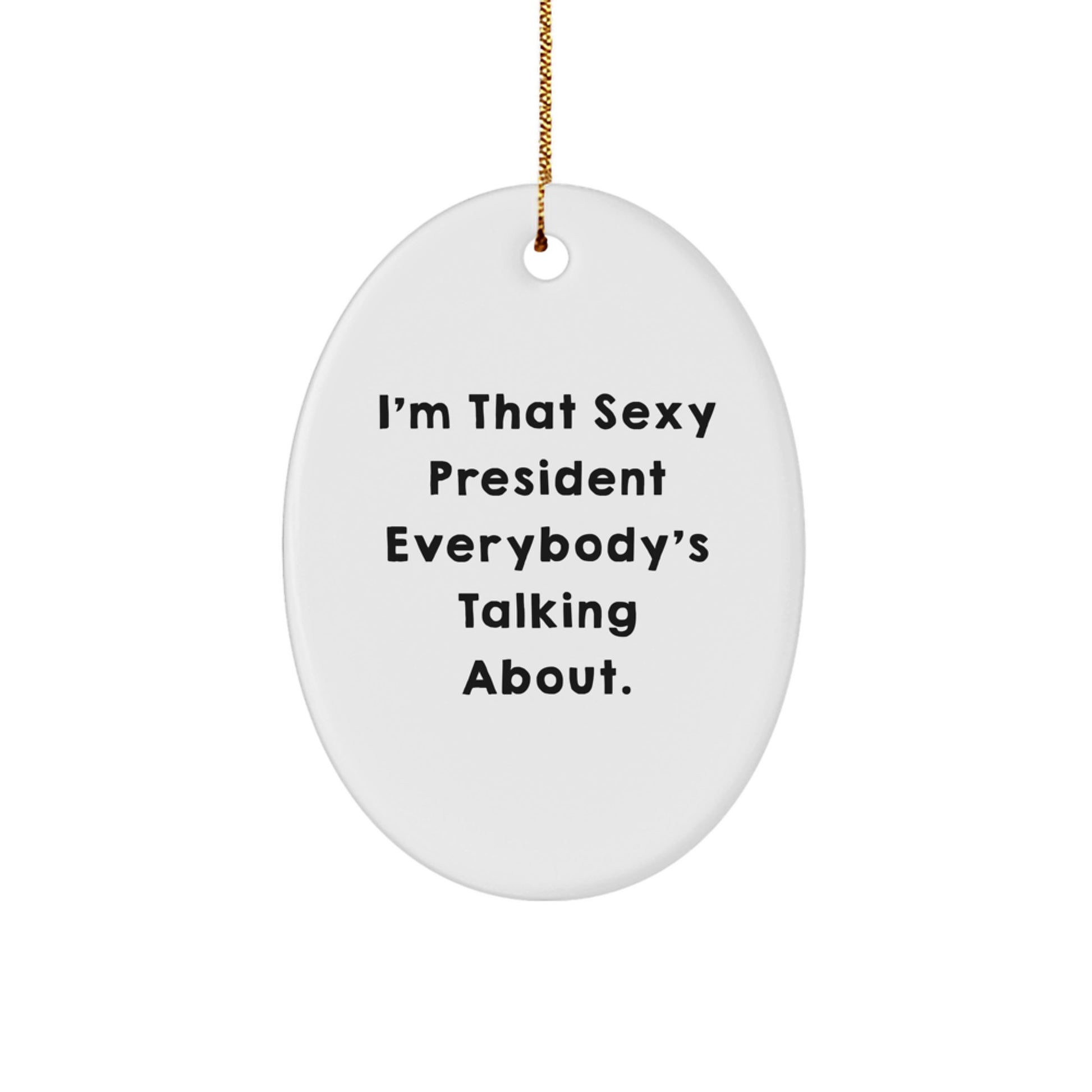- This Funny Sexy President Oval Ornament is the ideal gift for the President in your life. Made from sturdy MDF with a high-gloss plastic finish, it's both beautiful and long-lasting. The vibrant quote 'I'm That Sexy President Everybody's Talking About' is printed from edge-to-edge via Sublimation, ensuring bright, vivid colors that will last for years to come. Plus, it's lightweight and resistant to breaking, making it a great choice for households with children or pets.