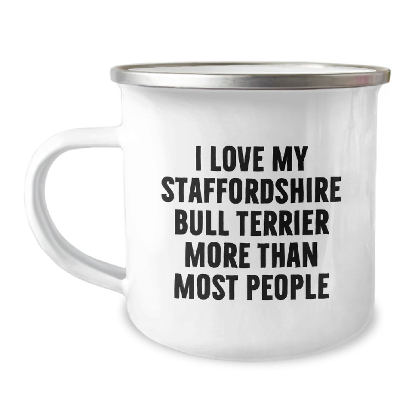 Are you a Staffordshire Bull Terrier Dog enthusiast or looking for a unique gift for a Staffordshire Bull Terrier Dog owner? Look no further! This camping mug is perfect for dog lovers who adore their Staffordshire Bull Terrier Dogs more than most people. The quote 'I Love My Staffordshire Bull Terrier More Than Most People' is a heartwarming expression of devotion and makes this mug a thoughtful gift for any Staffordshire Bull Terrier Dog owner. Whether you're a dog mom, dad, or just a dog lover, this camping mug is a must-have for any occasion, including birthdays. Give the gift of warmth and companionship with this cozy camping mug. Share your love for Staffordshire Bull Terrier Dogs with friends and family. 'I Love My Staffordshire Bull Terrier More Than Most People' is a funny and relatable quote that any Staffordshire Bull Terrier Dog lover will appreciate. Treat yourself or give this gift to a fellow dog enthusiast. Happy birthday to the special Staffordshire Bull Terrier Dog in your life!