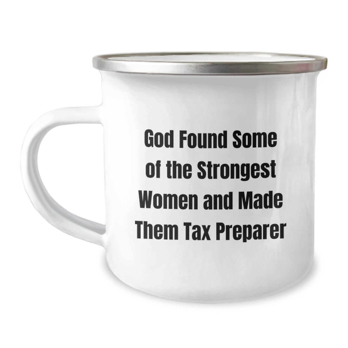 Are you looking for a unique gift for a Tax Preparer? Do you know someone who loves camping and has a sense of humor? This 'God Found Some Of The Strongest Women And Made Them Tax Preparer' mug is the ideal gift for any Tax Preparer enthusiast. Made of high-quality stainless steel with an enamel finish, this camping mug is sturdy and easy to clean. With its 12 oz capacity, it's perfect for hot or cold beverages on-the-go.