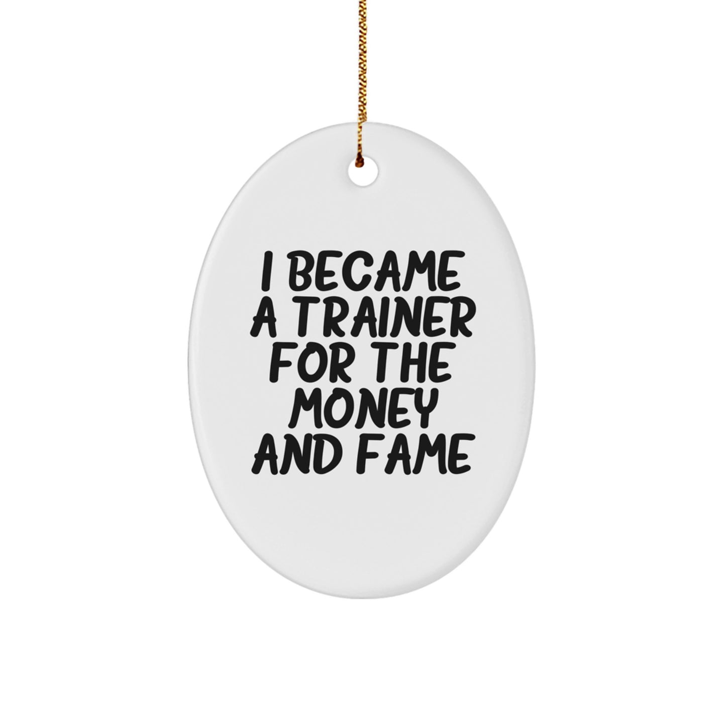 - Get a unique gift for the trainer in your life with this Funny Trainer Oval Ornament. Made from sturdy MDF with a high-gloss plastic finish, this Oval Ornament is crafted to last. Vibrantly printed from edge-to-edge via Sublimation, it features a funny quote that will make any trainer smile. Perfect for the trainer who loves Christmas decorations.
