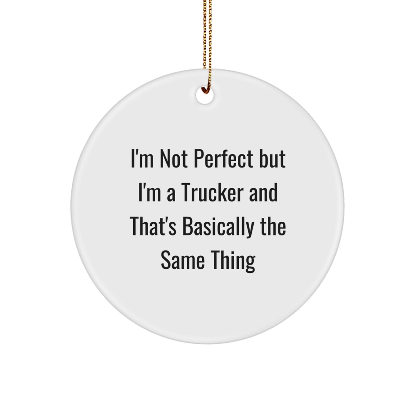 - This funny 'I'm Not Perfect But I'm A Trucker' Circle Ornament is a unique and thoughtful gift for any trucker who's always on the road. The sturdy MDF construction and high-gloss plastic finish ensure that it will last for years to come. The vibrant print and festive gold cord make it stand out and easy to hang. Whether it's for a birthday, Christmas, or just a random act of kindness, this ornament is sure to bring a smile to their face.