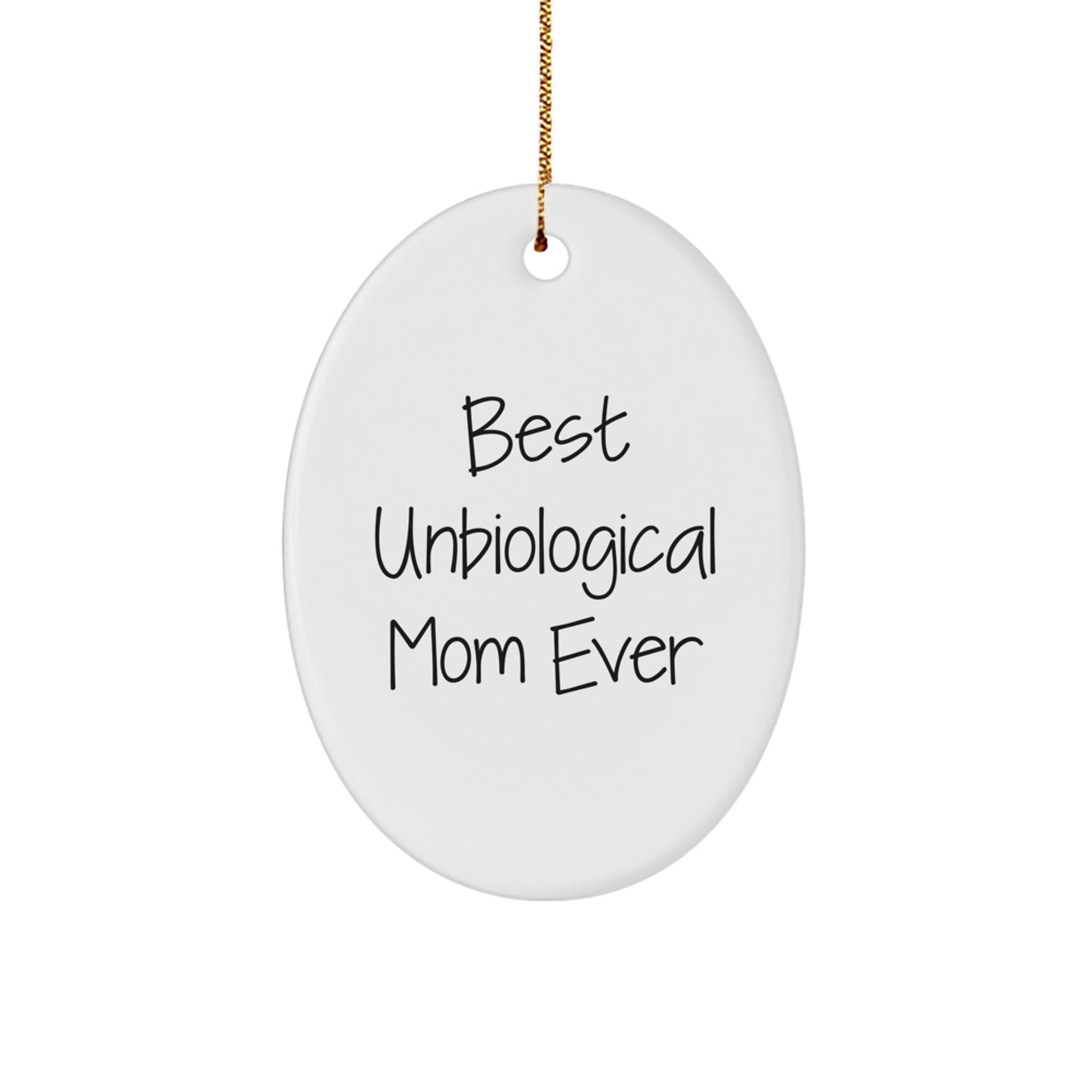 - Our Funny Unbiological Mom Oval Ornament is the perfect way to show your love and appreciation for the amazing Unbiological Mom in your life. Made from sturdy MDF and featuring a high-gloss plastic finish, this ornament is resistant to breaking and easy to hang. With its vibrant colors and hilarious quote, 'Best Unbiological Mom Ever', this ornament is sure to bring a smile to her face.